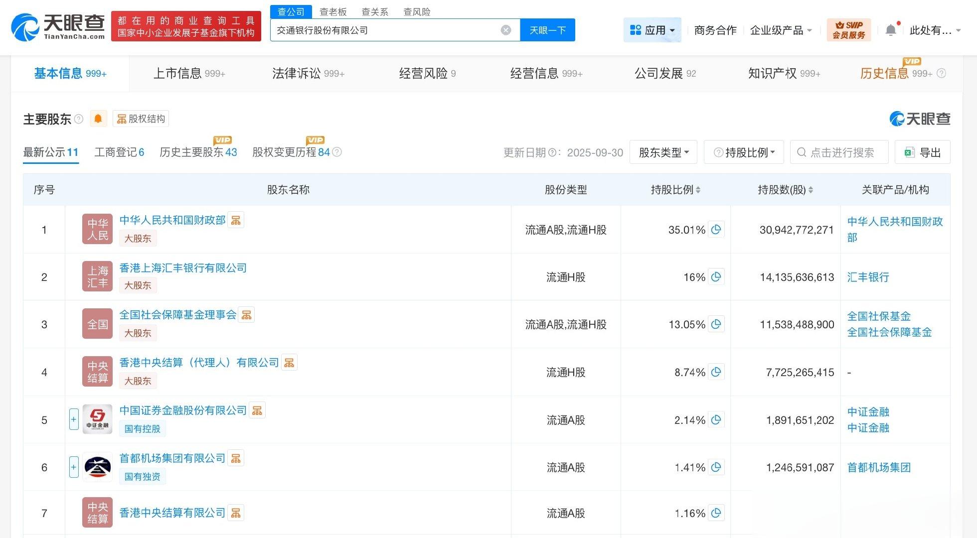 交通银行股份有限公司成立于1987年3月,法定代表人为任德奇,经营范围含吸收公众存款,发放短期、中期和长期贷款,办理国内外结算,办理票据承兑与贴现,发行金融债券,代理发行、代理兑付、承销政府债券等。股东信息显示,该公司由中国证券金融股份有限公司、首都机场集团有限公司、香港中央结算有限公司等共同持股。