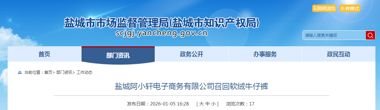 中国质量新闻网讯据江苏省盐城市市场监督管理局网站消息,日前,盐城阿小轩电子商务有限公司按照《消费品召回管理暂行规定》《江苏省缺陷消费品召回管理办法》的要求,主动向盐城市市场监督管理局报告了召回计划,将自即日起,召回2025年9月22日至2025年10月13日期间制造的软绒牛仔裤,规格型号:XM254320002-1,涉及数量为484件。
