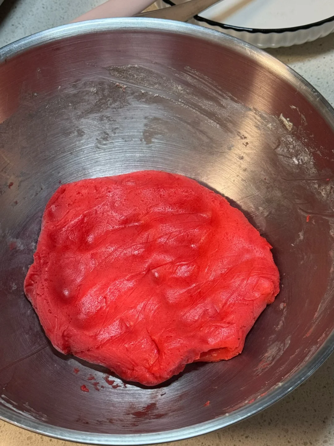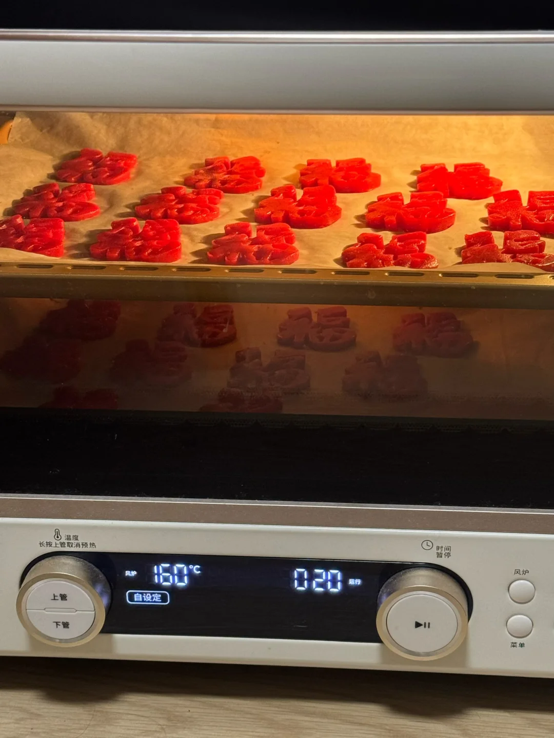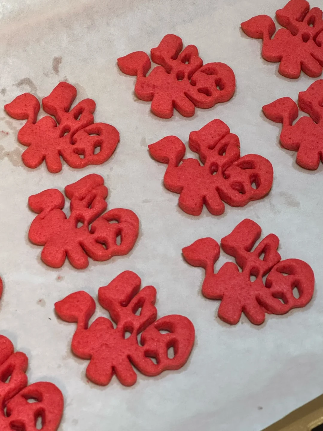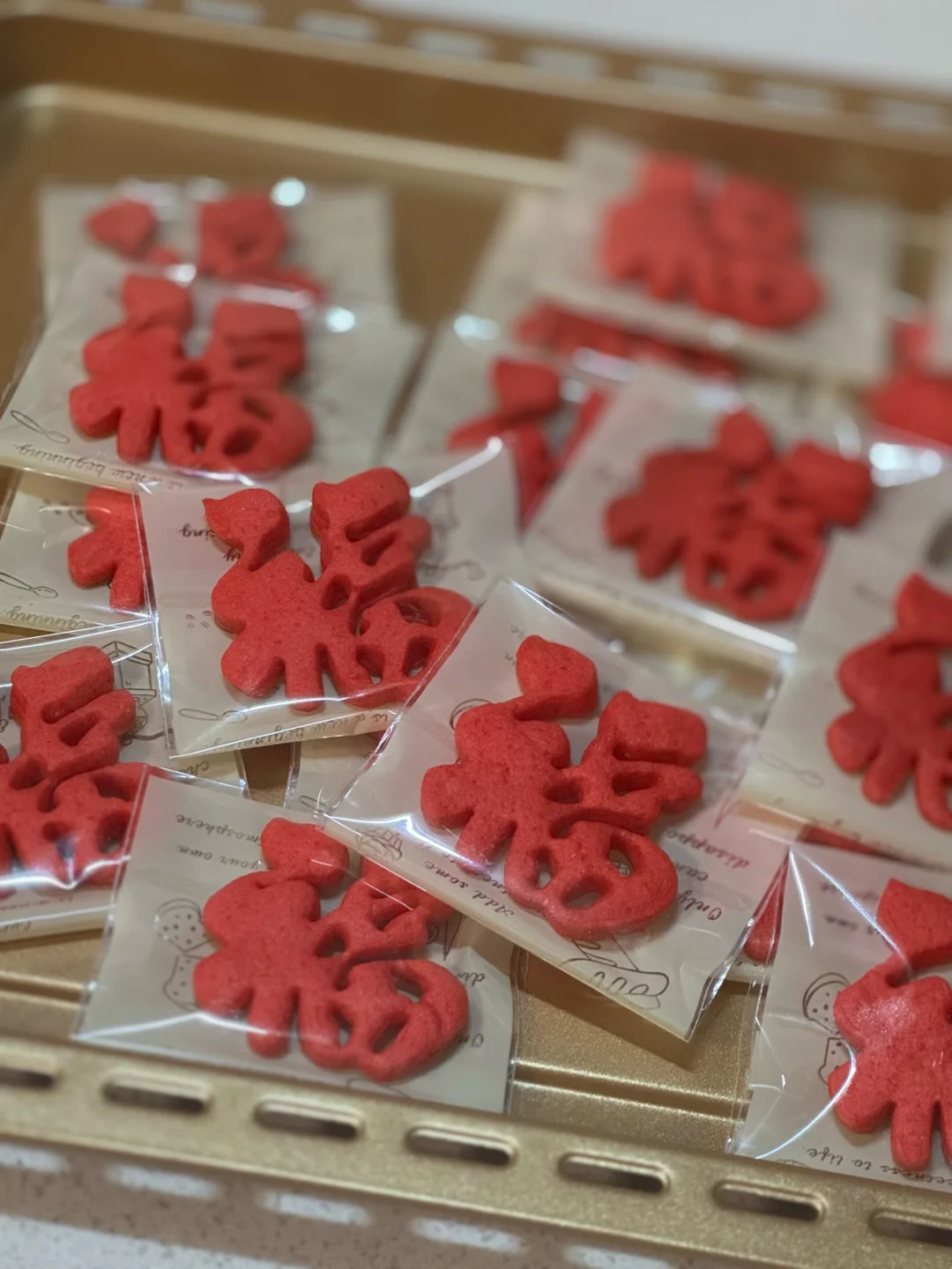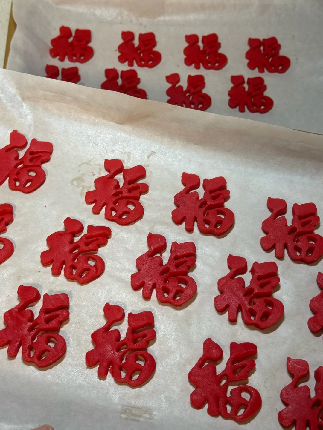 🧧食材(此配方可做25个福字小饼干) 黄油70g 细砂糖(糖粉)40g 鸡蛋30g(常温) 低筋面粉130g 红丝绒液几滴 🧧做法: 1.黄油软化后加入细砂糖或者糖粉翻拌均匀。 2.用打蛋器打发至蓬松发白。 3.分两次加入蛋液,每次混合均匀之后再加入下一次,筛入低筋面粉,翻拌成絮状,加几滴丝绒液,混合成团。 4.将面团放在油纸上,擀薄,放冰箱冷冻30分钟,再用模具压出形状,摆在烤盘上,送入烤箱,160度烘烤20分钟,晾凉后打包起来送亲朋好友,仪式感满满[派对R][派对R][派对R]