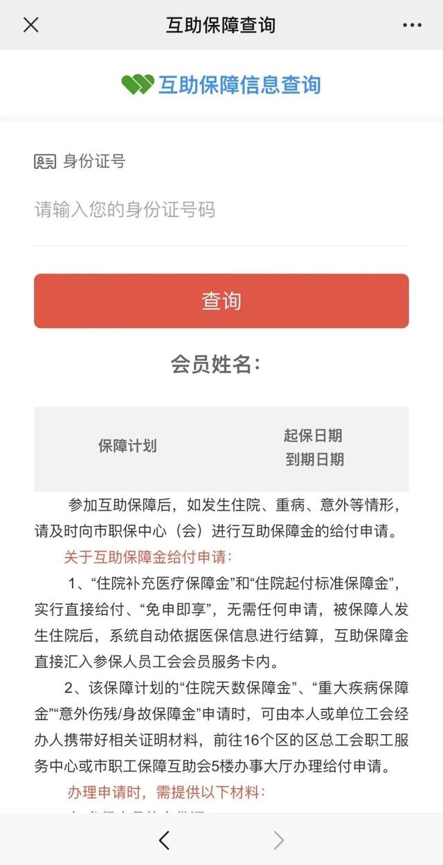 进入申工社微信公众号,点击[服务大厅-互助保障查询],输入[身份证号],勾选[我已阅读并知晓],点击[确认]即可查询到你的参保信息。