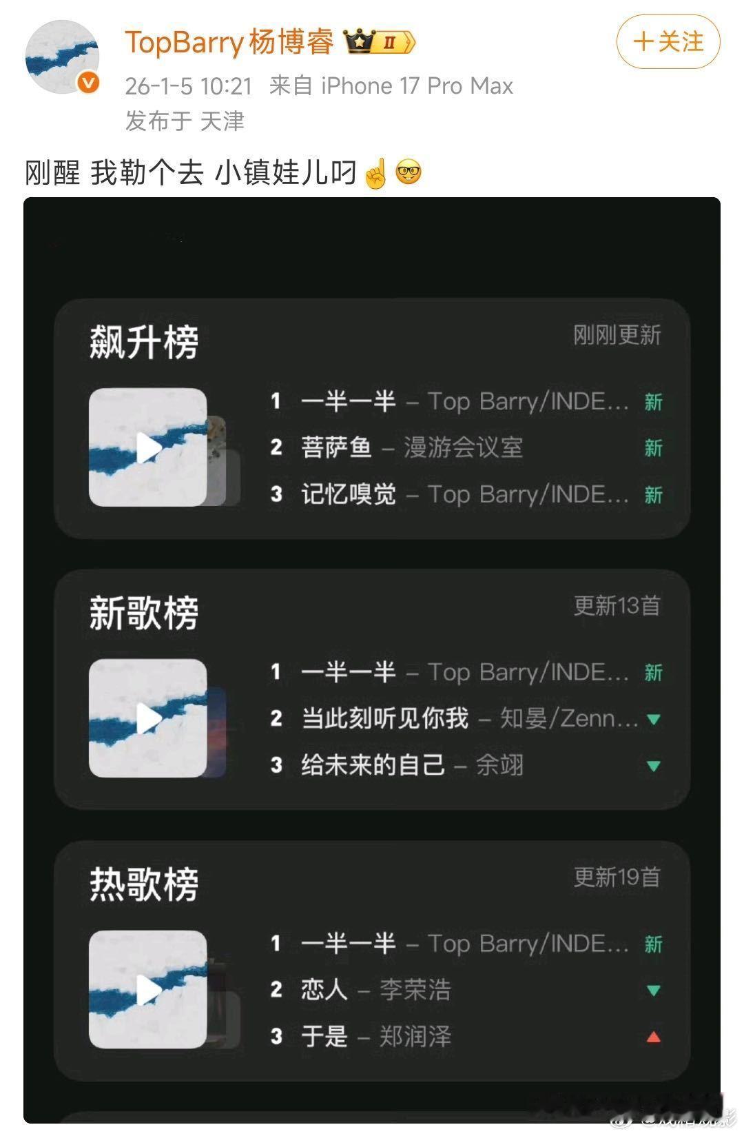 TopBarry一觉醒来榜一了谁能想到一觉醒来就被TopBarry的《一半一半》刷屏,各大榜单全是TOP1的好成绩,播放和收藏数据一路飙升。叙事感拉满的说唱搭配走心编曲,他的实力早就该被更多人发现,这波爆红实至名归。
