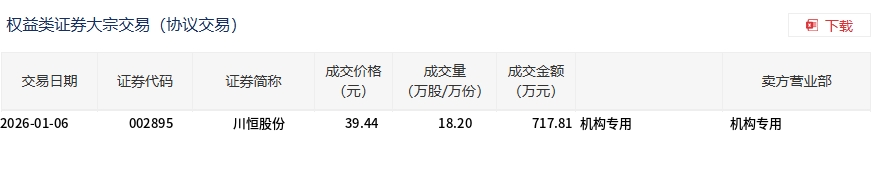 1月6日,川恒股份大宗交易成交18.2万股,成交额717.81万元,占当日总成交额的1.08%,成交价39.44元,较市场收盘价39.44元持平。