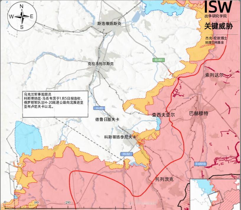 决战双子城之外围争夺:俄军在康斯坦丁诺夫卡取得进展 1月4日至5日,俄军率先在利曼附近展开牵制性进攻,多点出击形成对乌军的战术压迫。进攻范围覆盖利曼西北部的德罗比谢韦、亚罗瓦、新谢利夫卡一带及索斯诺韦方向,北部的斯塔夫基地区,东部的扎里奇涅与托尔斯基地区,形成多维度攻击态势。 针对俄军攻势,有俄罗斯军事博主称乌军在斯塔夫基附近发起局部反攻,但该消息暂未得到多方证实。乌克兰方面,驻守利曼方向的某旅级部队发言人1月5日披露,俄军仍沿用小规模渗透战术,由训练水平有限的士兵实施前沿推进,同时投入训练有素的无人机操作员,运用“睡眠无人机”精准拦截乌军后勤补给线,对乌军前线物资保障构成持续威胁。 1月4日至5日,俄军将进攻重心聚焦康斯坦丁诺夫卡(之前翻译为科斯季扬尼夫卡)及周边区域,展开全域多点袭击:东部直指普列德捷奇涅;东南部覆盖亚历山大-舒尔蒂内、斯图波奇基、普列希伊夫卡;南部波及谢尔比尼夫卡、伊万诺皮利亚;西南部向亚布卢尼夫卡及斯特帕尼夫卡方向突击;同时在德鲁日基夫卡以南(靠近鲁辛亚尔、朝贝列斯托克方向)及西南(靠近索菲伊夫卡、朝帕夫利夫卡方向)同步发起攻势,形成对康斯坦丁诺夫卡的合围施压态势。 康斯坦丁诺夫卡的战略价值至关重要,作为乌克兰在北顿涅茨克地区仅剩的三大核心城市之一,其不仅是连接克拉马托尔斯克与斯拉维扬斯克双子城的补给命脉,境内铁路与公路枢纽更承担着乌军前线物资输送、兵力调动的核心功能。控制此地,俄军可直接切断乌军向顿巴斯腹地增援的通道,对整个乌东防线形成压制,且能沿公路向北直逼克拉马托尔斯克,同时其工业区内的大规模武器库及俄方科研机构高度关注的“独特技术特征”设备,进一步放大了该城的争夺意义。 乌克兰军事观察员马绍韦茨报告称,俄军沿H-20波克罗夫斯克—康斯坦丁诺夫卡公路,已向康斯坦丁诺夫卡西南方向的亚布卢尼夫卡以北区域推进,形成从利曼向康斯坦丁诺夫卡侧翼包抄的趋势。 马绍韦茨1月5日的报告进一步证实,俄军正集中力量突破康斯坦丁诺夫卡东南部与东部地区,在东南部郊区持续开展渗透行动,试图巩固阵地并扩大存在。同时,俄军重点在康斯坦丁诺夫卡以南及西南方向集结步兵力量,组建前沿突击集群,目标直指突破斯捷帕尼夫卡—别列斯托克一线,为后续纵深推进打开缺口。此外,乌军某旅报告称,俄军正利用恶劣天气条件,向康斯坦丁诺夫卡东北部的恰西夫亚尔推进,攻势强度持续提升。 为支撑康斯坦丁诺夫卡方向攻势,俄军指挥部已完成大规模兵力集结,目前已有三大合成兵种集团军及1个军团投入作战:包括隶属于南方军事区、原第2卢甘斯克人民共和国军团的第3合成兵种集团军,同属南方军事区的第8合成兵种集团军,原第1顿涅茨克人民共和国军团、隶属南方军事区的第51合成兵种集团军,以及受南方兵力集团作战指挥的第3军团,形成多兵团协同作战格局。 但是,马绍韦茨的报告内容部分信息也需要进一步证实,如报告称俄军目前未在康斯坦丁诺夫卡以南的伊万诺皮利亚驻守,但国际战略研究所此前评估显示,俄军已于去年11月21日占领该地,两地信息差异或源于战场控制权的动态变化。此外,有俄罗斯军事博主声称俄军已向德鲁日基夫卡西南的索菲伊夫卡以北推进,该消息尚未得到独立信源证实。