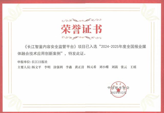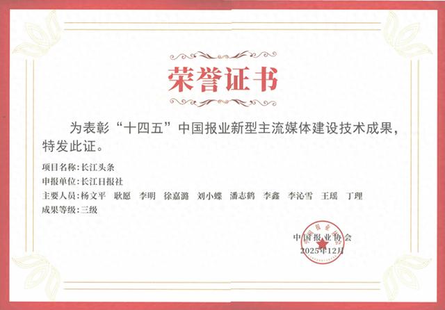 长江网讯(记者唐婕)日前,中国报业协会颁发荣誉证书,长江日报社申报的长江网“长江头条”荣获“十四五”中国报业新型主流媒体建设技术成果等级三级,《长江智鉴内容安全监管平台》项目入选“2024-2025年度全国报业媒体融合技术应用创新案例”。