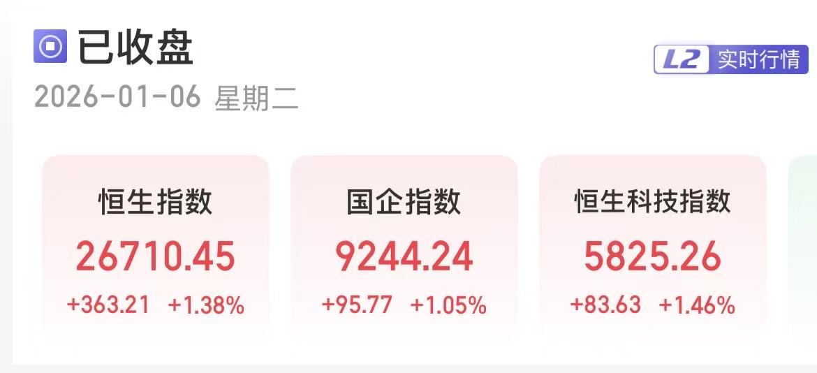 上证报中国证券网讯(刘禹希记者严晓菲)1月6日,港股三大指数收涨。截至收盘,恒生指数涨1.38%,报26710.45点;恒生国企指数涨1.05%,报9244.24点;恒生科技指数涨1.46%,报5825.26点。