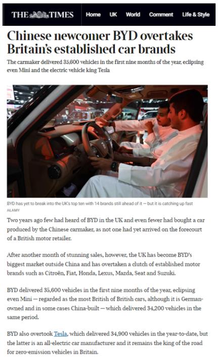 月销破万,比亚迪9月英国销量同比激增880%. 2025年9月,比亚迪在英国市场的乘用车销量达到了11271辆,在欧洲实现单一市场月销破万,同比增长880%,环比增长541%。今年前九个月,比亚迪汽车在英累计销量达到35604辆,同比增长576.9%,全市场销量超越了特斯拉、Mini等一众知名汽车品牌同期在英国的销量。 作为全球汽车产业的重要阵地,英国凭借成熟的消费市场,一直是中国车企出海的“必争之地”。而比亚迪仅用两年时间,便在此书写了“后来者居上”的出海样本。 比亚迪在英国市场的高速增长,也吸引了英国主流媒体的高度关注。英国广播公司(BBC)报道“中国电动汽车巨头比亚迪9月英国销量创下新高”;《泰晤士报》则以“中国新晋品牌比亚迪超越英国老牌汽车品牌”为题,指出“两年前英国几乎没人听说过比亚迪”;《金融时报》更进一步强调“英国成为比亚迪最大的国际市场”。 “了不起”的成绩背后,是比亚迪在英国市场从零到一开拓深耕的“不容易”。2023年,比亚迪乘用车初次进入英国市场时,英国消费者对这个中国品牌知之甚少,只有单一车型,主流经销商集团顾虑重重。为打开局面,比亚迪团队采取“多管齐下”的攻坚策略,通过高频拜访经销商、打造店端活动样本等举措,快速引入完整的车型布局,逐步构建起强大的渠道体系力。 从首批4家先锋店开业,到如今过百家门店覆盖英国全境主要地区,比亚迪仅用了两年时间,便将渠道合作的态势彻底逆转,在欧洲实现单一市场月销破万:最初是比亚迪寻求与经销商合作开店,如今变成了经销商主动排队争取合作。 英国市场的突破,只是比亚迪全球化布局的一个缩影。截至2025年10月,比亚迪新能源汽车已远销全球117个国家和地区,而其全球化产能与物流体系也在同步升级。比亚迪巴西工厂10月迎来比亚迪全球“第1400万辆新能源汽车”下线,巴西总统卢拉亲临见证,并成为比亚迪车主。同时,比亚迪8艘汽车运输船也已全部投入运营,构建起“高效、安全、环保”的全球物流网络,有力保障产品及时交付至全球用户。