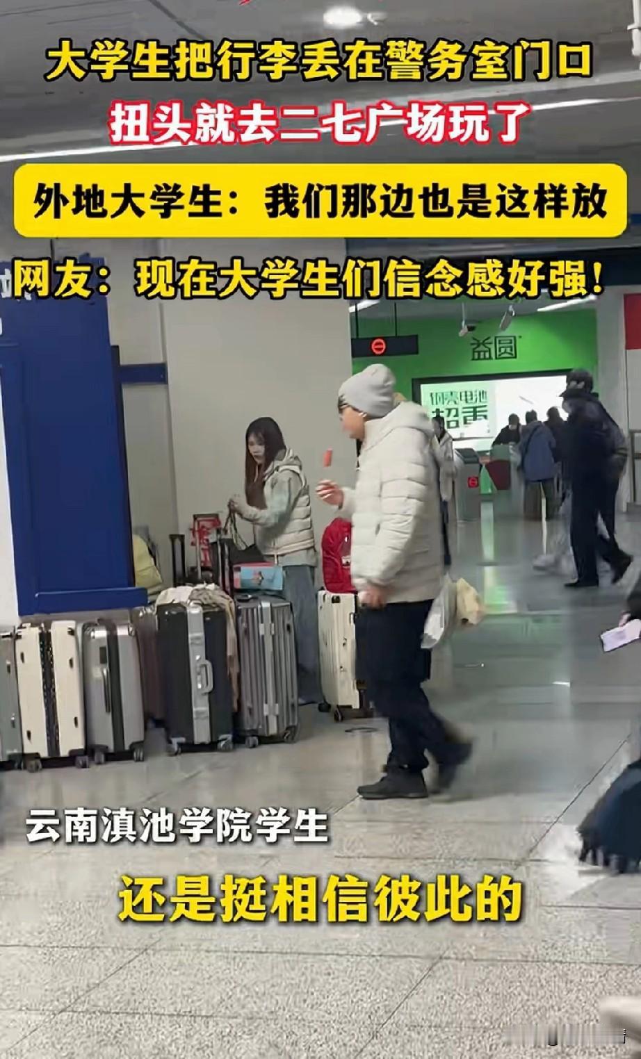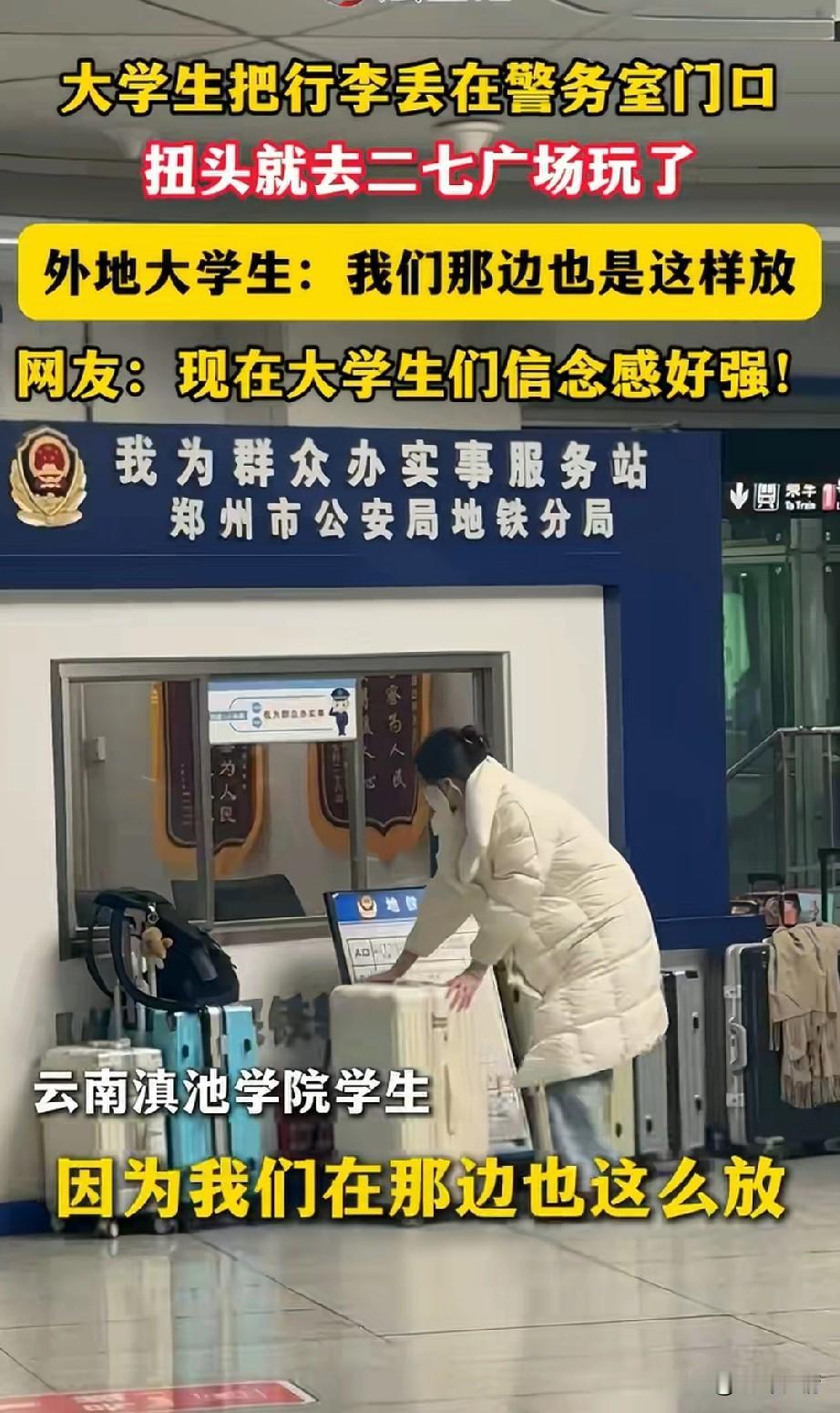 大家都知道徐州地铁站可以免费寄存行李,郑州的地铁站是没有这项服务的, 结果一帮大学生愣是给郑州地铁警务室上强度, 下了火车后,直接就将行李放在了郑州市公安地铁分局房子外面, 这可把当地的叔叔整蒙了, 这种场景还是第一次见, 随着几个行李箱放在那儿之后, 形势愈发的诡异, 很多年轻人都把行李放在了那儿, 一时之间那里竟然成了免费看行李的地方,这可把当地的记者吸引了过来, 记者采访她们为什么这么做? 女生表示自己是云南滇池学院的学生, 在云南她们都是这样干的, 这次来郑州游玩, 是拉着皮箱过来的, 带着很不方便, 干脆直接将行李放在了地铁分局外面, 相信这里是比较安全的, 然后直接就去二七广场玩了, 因为在云南一直都是可以这样干的, 网友表示现在的大学生信念感真强! 那是真的不敢丢呀, 这行李要是丢了,可就全国丢脸了! 还是外省的大学生会整活, 相信以后大学生都会效仿了, 这样也省去了存行李收费的钱了, 妥妥一杯奶茶又到手了! 大家对于外地大学生将行李放在郑州地铁警务室门口这事怎么看? 郑州爆料地铁提速生活 郑州寄存行李