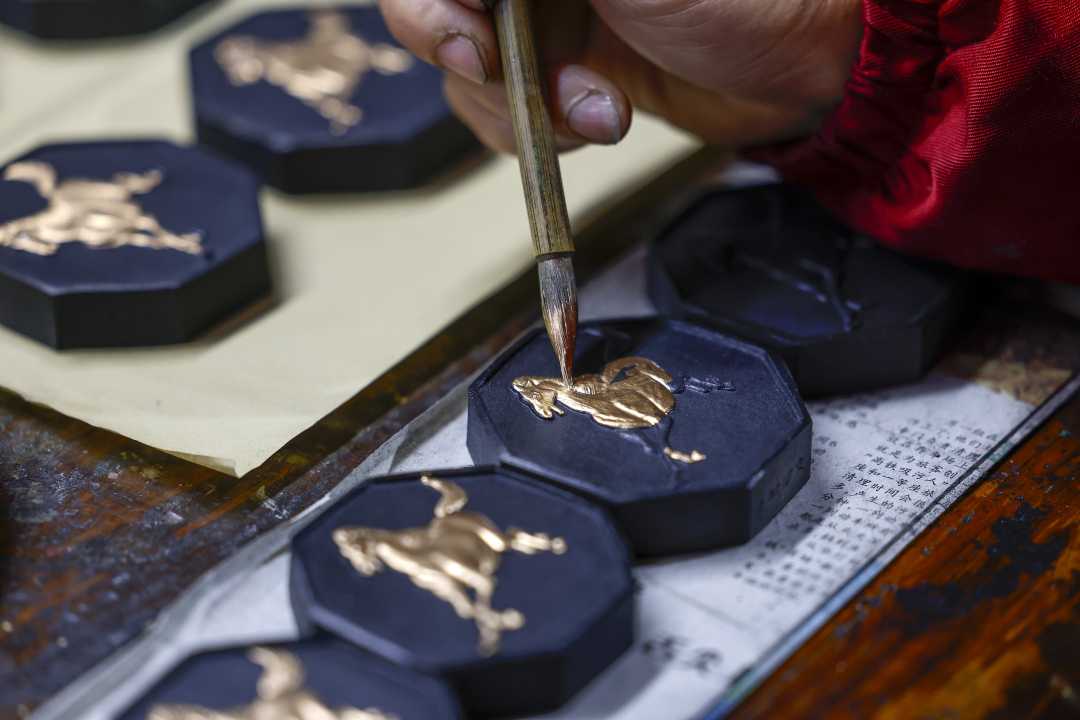1月5日,安徽省黄山市歙县老胡开文墨厂,制墨手艺人在为马年主题徽墨描金。