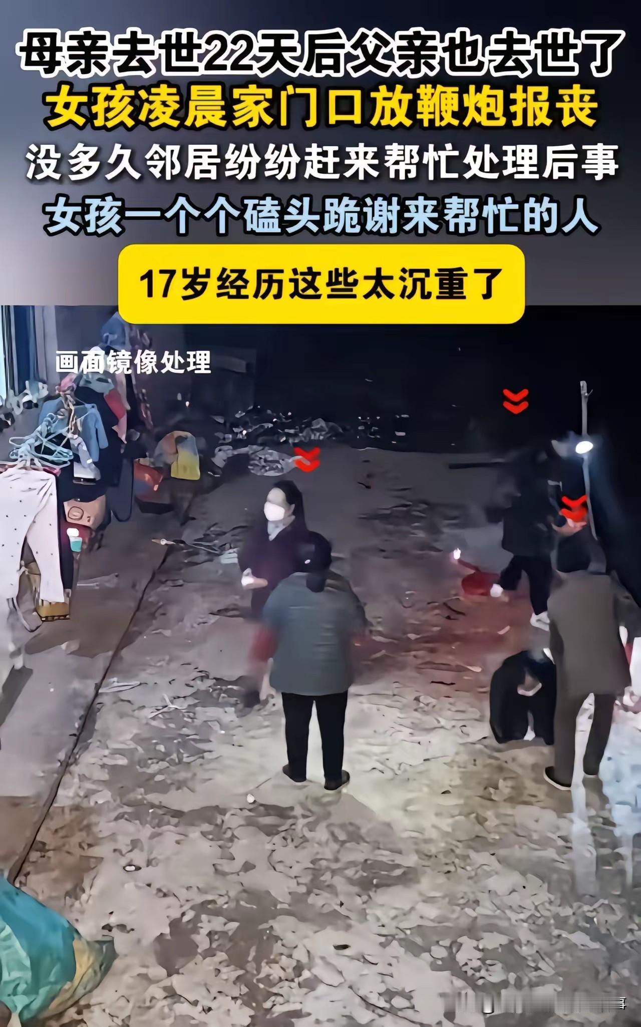 泪崩!双亲22天内相继离世,17岁女孩凌晨放鞭报丧,一个动作看哭全网! 凌晨三点的小巷,没有新年的欢腾,只有一阵突兀又细碎的鞭炮声划破寂静。 17岁的林晓(化名)站在自家门口,冻得通红的手紧紧攥着最后一挂鞭炮的引线。22天前,她刚送走因癌症离世的母亲;今天,常年劳累、悲伤过度的父亲也突发心梗,倒在了为妻子守灵的灵堂旁。 这个还在读高二的女孩,一夜之间成了无依无靠的孤儿。她不知道该找谁帮忙,只记得村里老人说过,家里有人过世,要放鞭炮告知邻里。她翻遍家里的角落,只找到几挂过年剩下的小鞭炮,哆哆嗦嗦地点燃,在凌晨的寒风里,那噼啪声显得格外孤单。 她以为,这个时间点,邻居们都在熟睡,不会有人听见。可鞭炮声刚落,隔壁的王大爷就披着大衣冲了出来,紧接着,对门的李阿姨、斜对面的张叔叔……一户户人家的灯接连亮起,十几位邻居很快聚在了她家门前。 “孩子,别怕!有我们在!”王大爷的声音带着哽咽,一把将林晓护在身后。邻居们自发分工,有的联系殡仪馆,有的帮忙布置灵堂,有的回家端来热粥让林晓垫肚子。 忙乱中,林晓突然走到院子中央,对着赶来的邻居们深深鞠了一躬。她没有哭嚎,只是挺直脊背,弯腰时额头几乎碰到膝盖,这个动作持续了足足十秒。“谢谢叔叔阿姨,谢谢爷爷奶奶……”她的声音沙哑,却字字清晰。 这一幕,被赶来帮忙的亲戚拍了下来,发到了网上。网友们瞬间破防:“17岁的年纪,本该在父母怀里撒娇,她却要独自面对生离死别”“那深深的一躬,是绝望里的教养,太让人心疼了”“邻里的温暖,是这个寒冬里最亮的光”。 目前,社区工作人员已经介入,为林晓协调了后续的生活和学业问题。邻居们也约定,以后会轮流照顾这个可怜的孩子,让她知道,她从来都不是一个人。 素材来源于,侵权删除。