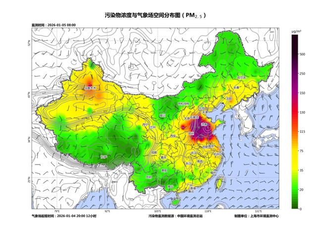 受不利气象条件影响,近日河北、山西、山东、河南北部等地出现PM2.5重度污染过程。1月5日早晨,在西北风作用下,上海PM2.5浓度逐渐上升。