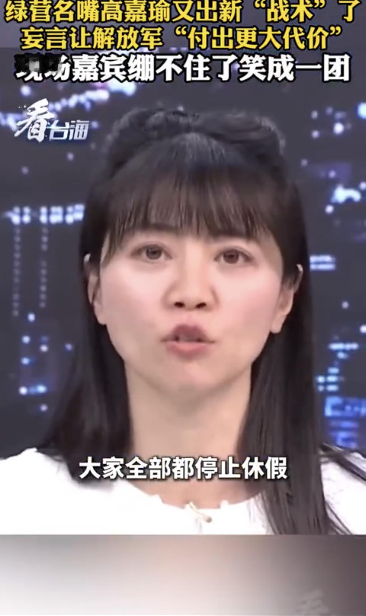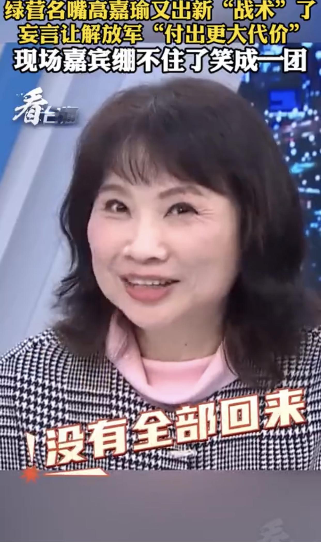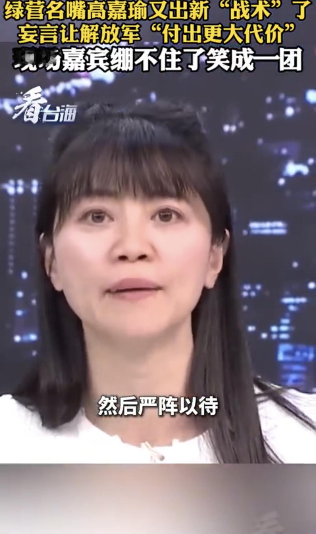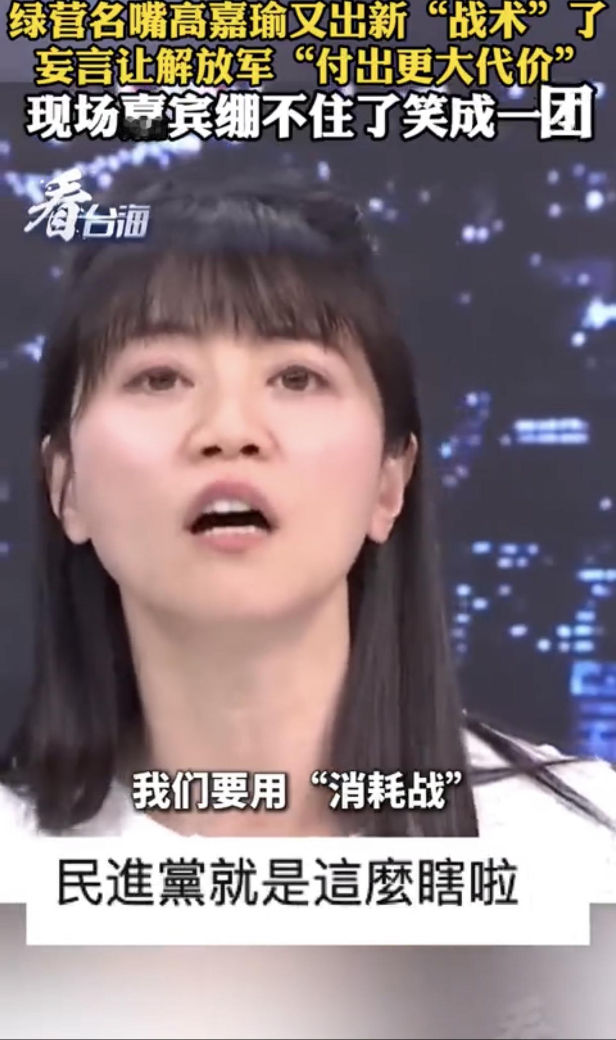 台湾高嘉瑜表示:“大陆这次围台军演,台军表现得非常好,演习开始后就第一时间召开记者会,告诉我们做了什么‘准备’,大家全部都停止休假,然后严阵以待,而且都是第一时间‘回来’,反正我们就是要用‘时间战’、‘消耗战’,来让大陆‘付出更大代价‘。”