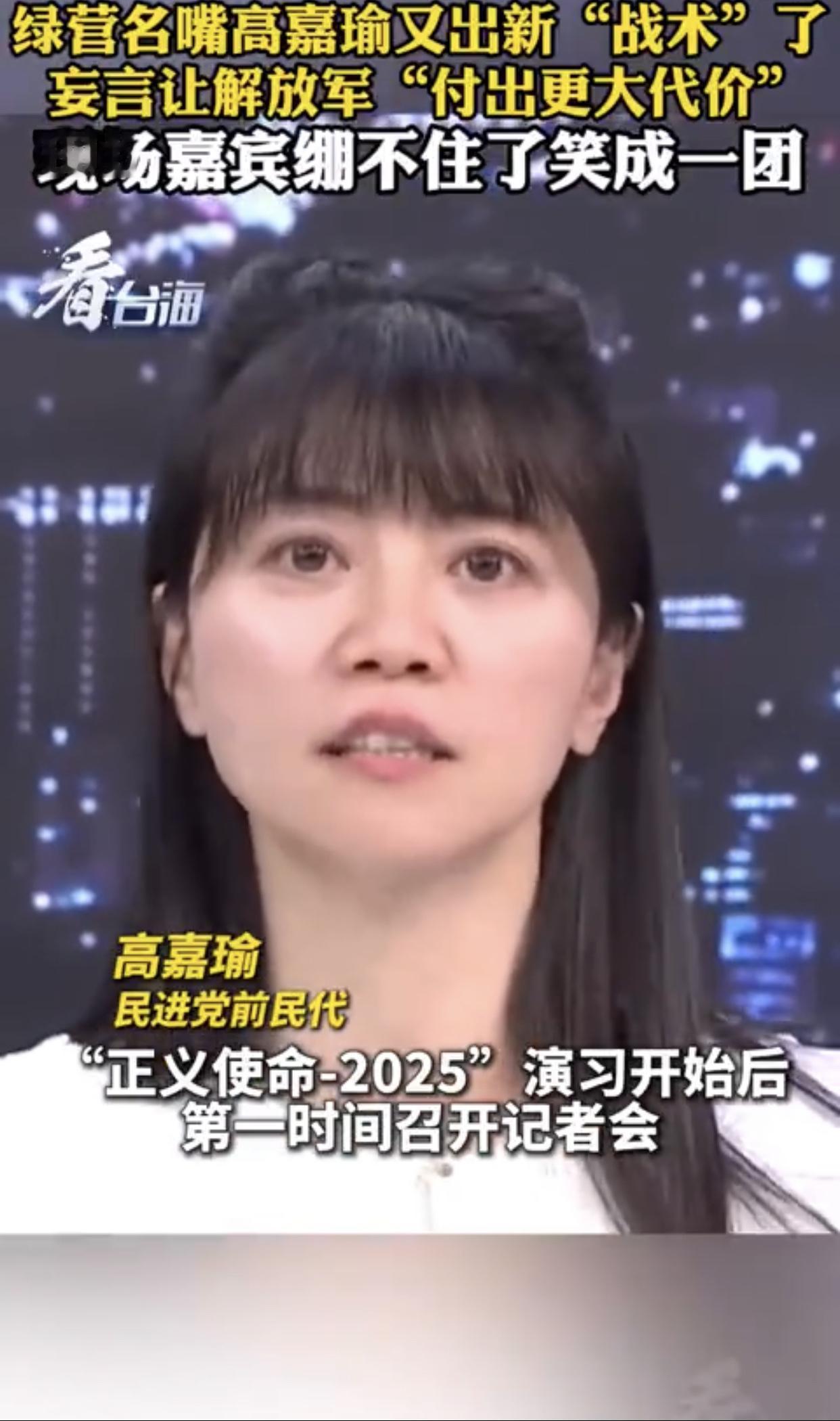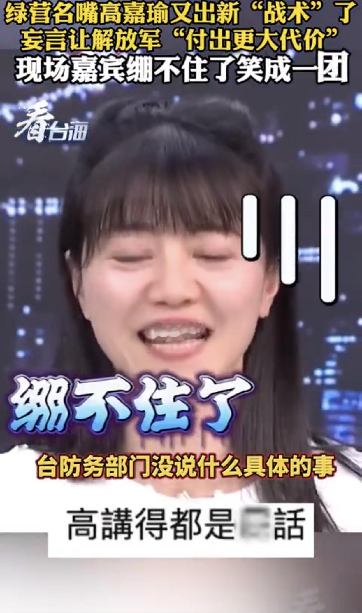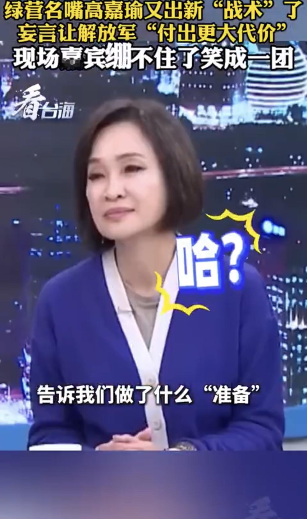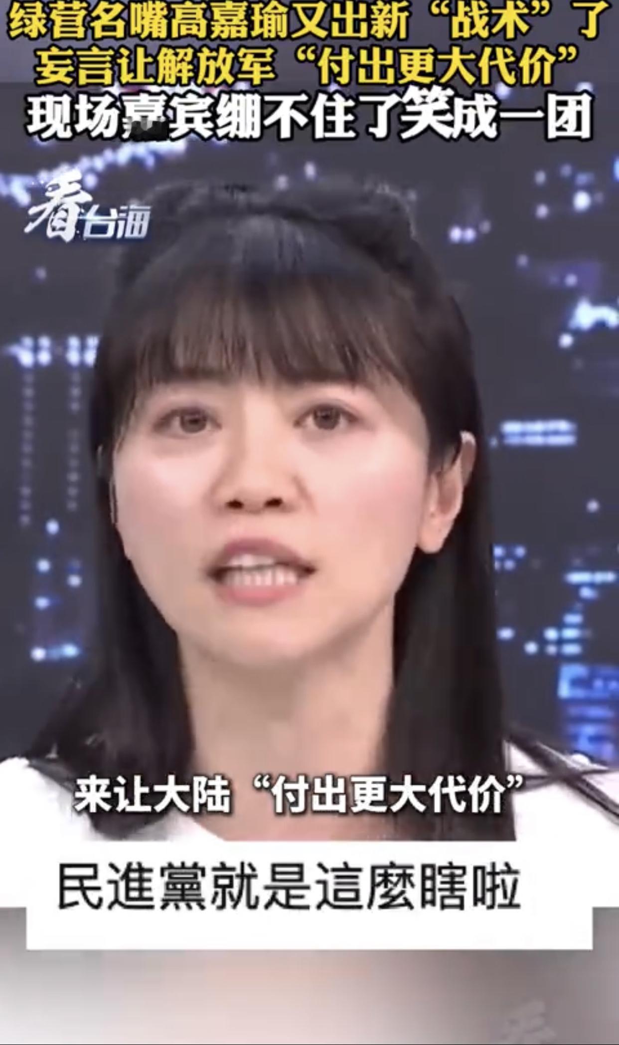 台湾高嘉瑜表示:“大陆这次围台军演,台军表现得非常好,演习开始后就第一时间召开记者会,告诉我们做了什么‘准备’,大家全部都停止休假,然后严阵以待,而且都是第一时间‘回来’,反正我们就是要用‘时间战’、‘消耗战’,来让大陆‘付出更大代价‘。”