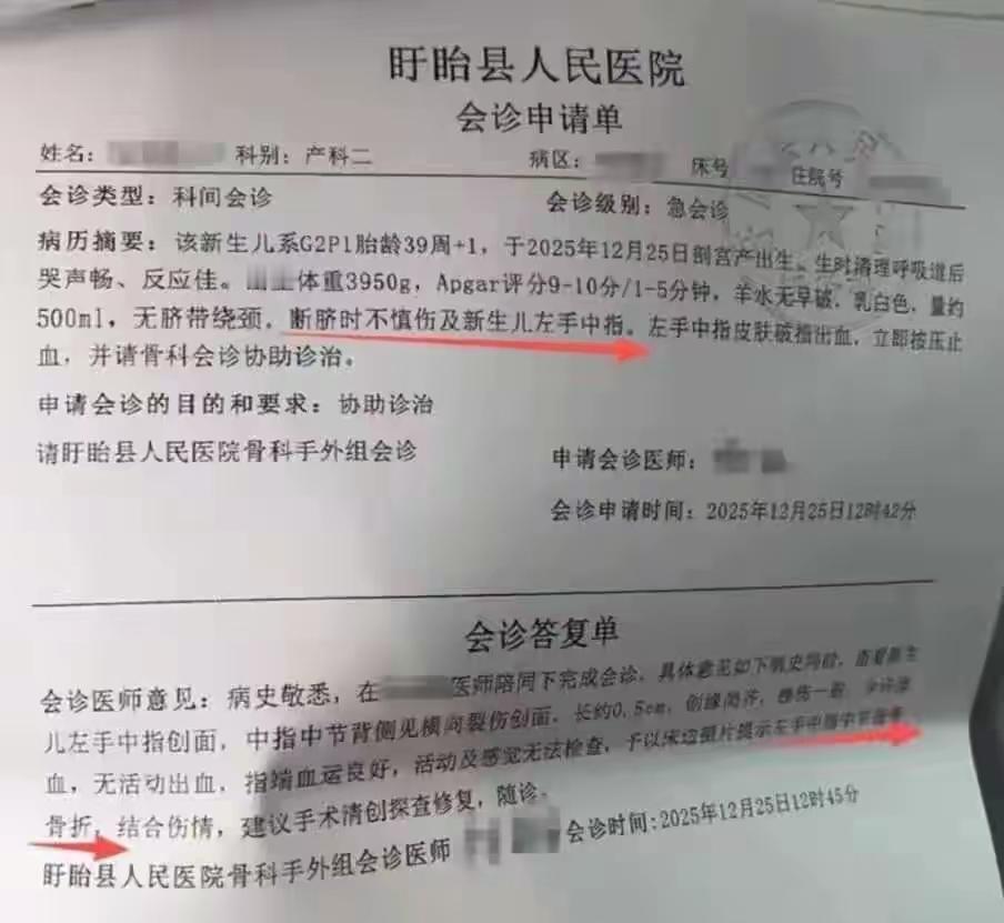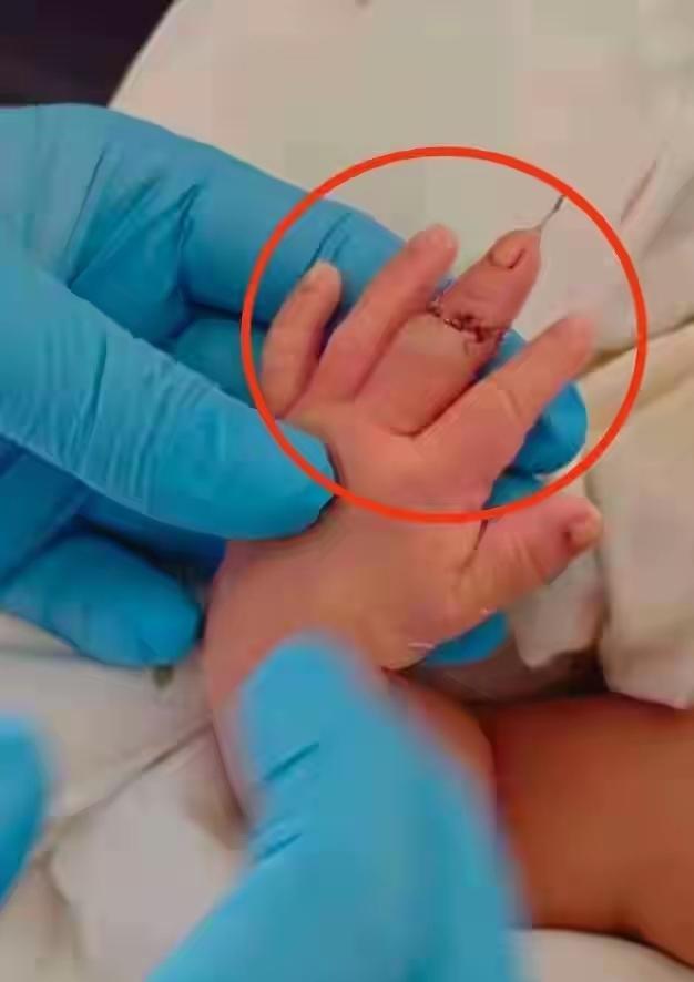 太离谱,手指被当脐带剪断!新生儿脸涨红哭得撕心裂肺,好心疼 迎接新生命的喜悦,能有多快变成锥心刺骨的痛?江苏盱眙这场产房意外,看得人血压直飙。 剖宫产的男宝刚落地,助产士剪脐带时竟失手剪断宝宝左手中指!小婴儿脸憋得通红,哭声都快断气,还没在妈妈怀里捂热乎,就被连夜转院两次抢救。纱布裹得厚厚的,渗着血印,再植手术再及时,那根小手指能不能恢复如初,还是个未知数。 更气人的是涉事方甩锅“孩子手乱动”,这话简直离谱到家!新生儿好动是常识,专业医护人员连这点预判都没有,说到底就是责任心缺位。医疗操作容不得半点马虎,更何况是对脆弱的新生儿。 医院垫付费用却拖延赔偿,家属维权之路漫漫。你觉得,这种低级失误该如何杜绝,才能护得住每个新生宝宝的平安