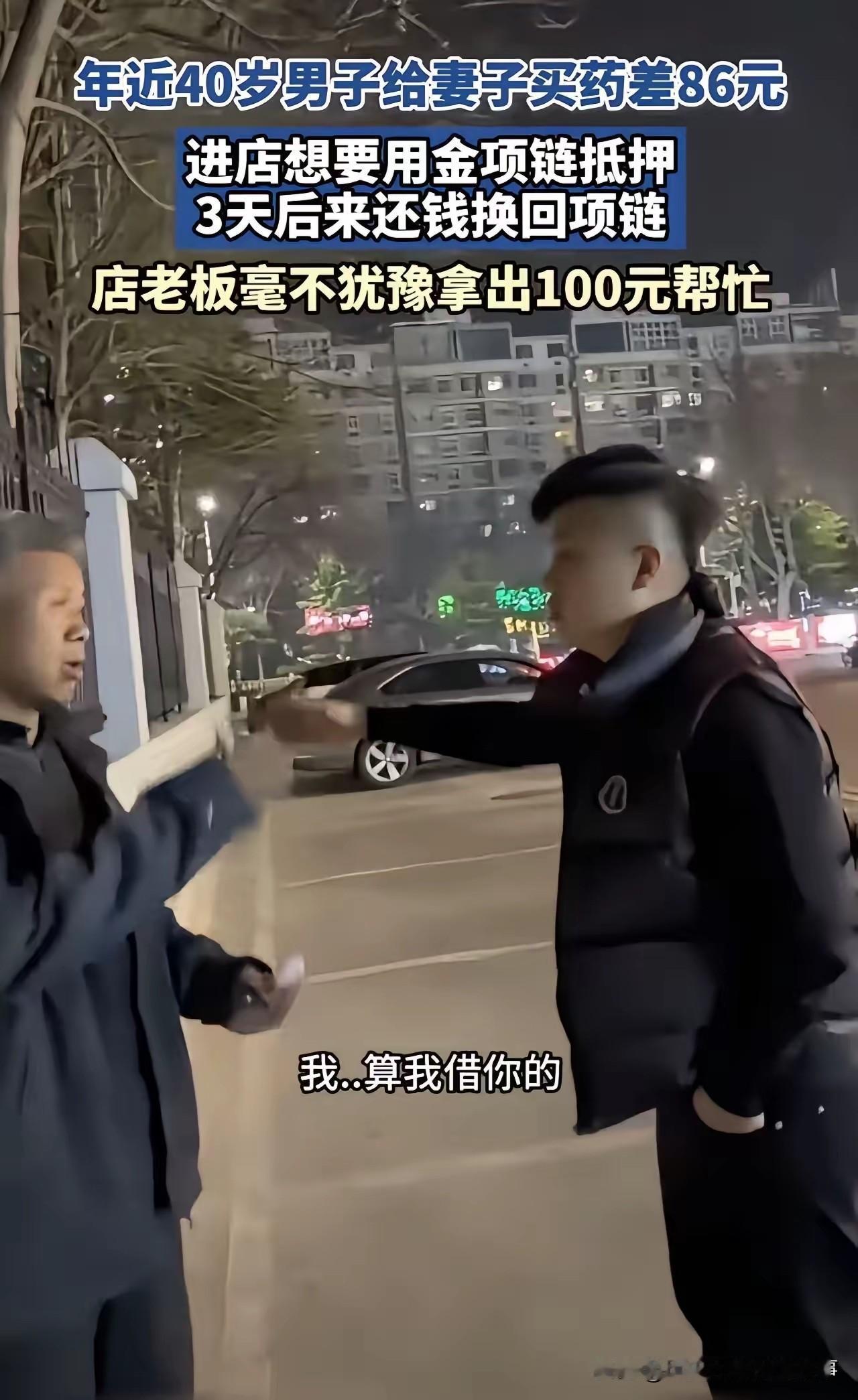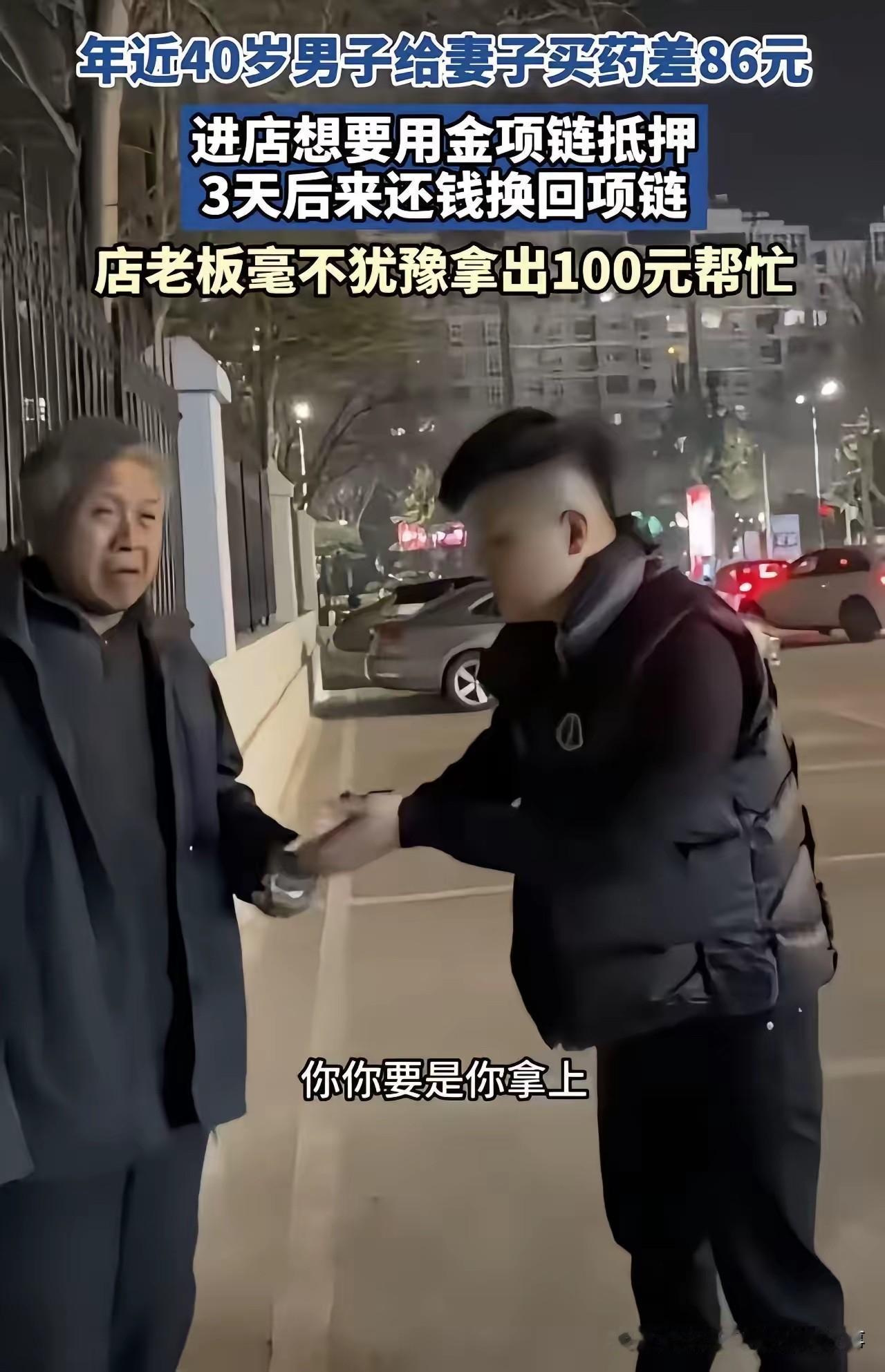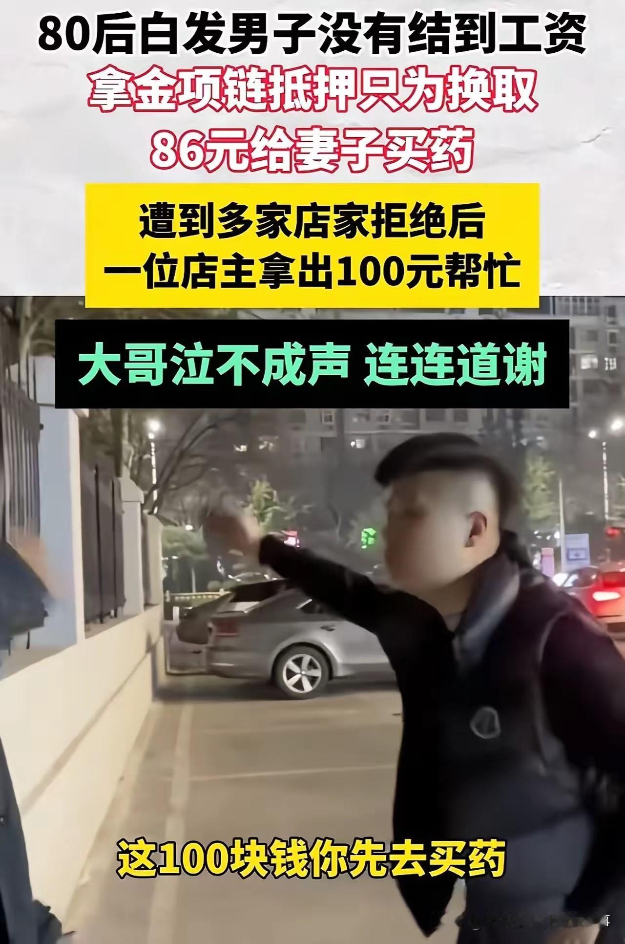 破防!40岁男子满头白发为妻买药差86元,金项链抵押遭拒,陌生店主一句话看哭全网! 寒风裹着细雨的傍晚,药店门口的台阶上,40岁的周强(化名)死死攥着一条磨得发亮的金项链,脊背佝偻得像一张被揉皱的纸。他的头发早已白了大半,看起来比实际年龄苍老十岁,口袋里的零钱凑了又凑,离妻子急需的抗癌药费用,还差整整86元。 这条项链是两人结婚时,他咬牙给妻子买的唯一信物,如今成了他最后的希望。他走进街对面的首饰店,声音带着颤抖询问能否抵押,店主瞥了一眼项链,又看了看他满身的尘土,不耐烦地挥手拒绝:“不收抵押,快走快走!”接连跑了三家店,得到的都是同样冰冷的驱赶。 妻子躺在病床上的模样在脑海里不断闪现,周强的眼眶泛红,脚步也变得踉跄。他几乎要放弃时,街角一家小超市的店主王大哥注意到了他的异样。听完周强的哭诉,王大哥没有丝毫犹豫,从抽屉里掏出100元现金塞到他手里:“快拿去买药,这钱不用还,也不用抵押什么项链。” 周强愣在原地,想要把项链硬塞给王大哥,却被对方推了回来:“我信你不是骗子,就算真被骗了,我也认了!谁家还没个难处呢?”这句话像一道暖流,瞬间击溃了周强的心理防线,这个在生活重压下从未掉过泪的男人,当场红了眼眶,对着王大哥深深鞠了一躬。 后来,周强带着妻子的康复证明和100元钱登门感谢,王大哥却笑着摆手,说这只是举手之劳。这段经历被周强的亲戚发到网上后,网友们纷纷破防:“四十岁的白发,是生活的重量,也是爱的重量”“金项链抵押的是无奈,店主的100元给的是希望”“善良从来都不是昂贵的东西,却能照亮最黑暗的时刻”。 如今,周强的妻子病情逐渐稳定,他也经常在闲暇时去王大哥的超市帮忙,两个素不相识的人,因为一份善意结下了温暖的缘分。 素材来源于网络,侵权删除。