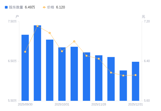 日期A股户数(户)流通A股户均持股数(股)户均持股市值(万元)2025-12-316486219462.1611.912025-12-196266420144.8112.312025-12-106605119111.8111.792025-11-286649118985.3412.252025-11-206723318775.8112.222025-11-106863818391.4812.512025-10-316850018428.5312.162025-10-207044617919.4612.492025-10-107404217049.1712.122025-09-307166617614.4111.61