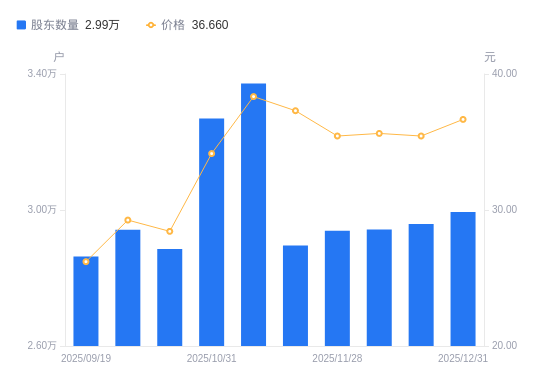日期A股户数(户)流通A股户均持股数(股)户均持股市值(万元)2025-12-312993819928.7573.062025-12-192959120162.4471.462025-12-102942320277.5672.252025-11-282939120299.6471.942025-11-202895320606.7376.862025-11-103371817694.6167.842025-10-313269318249.3762.322025-10-202885520676.7258.782025-09-302942020279.6359.342025-09-192863420836.3154.59