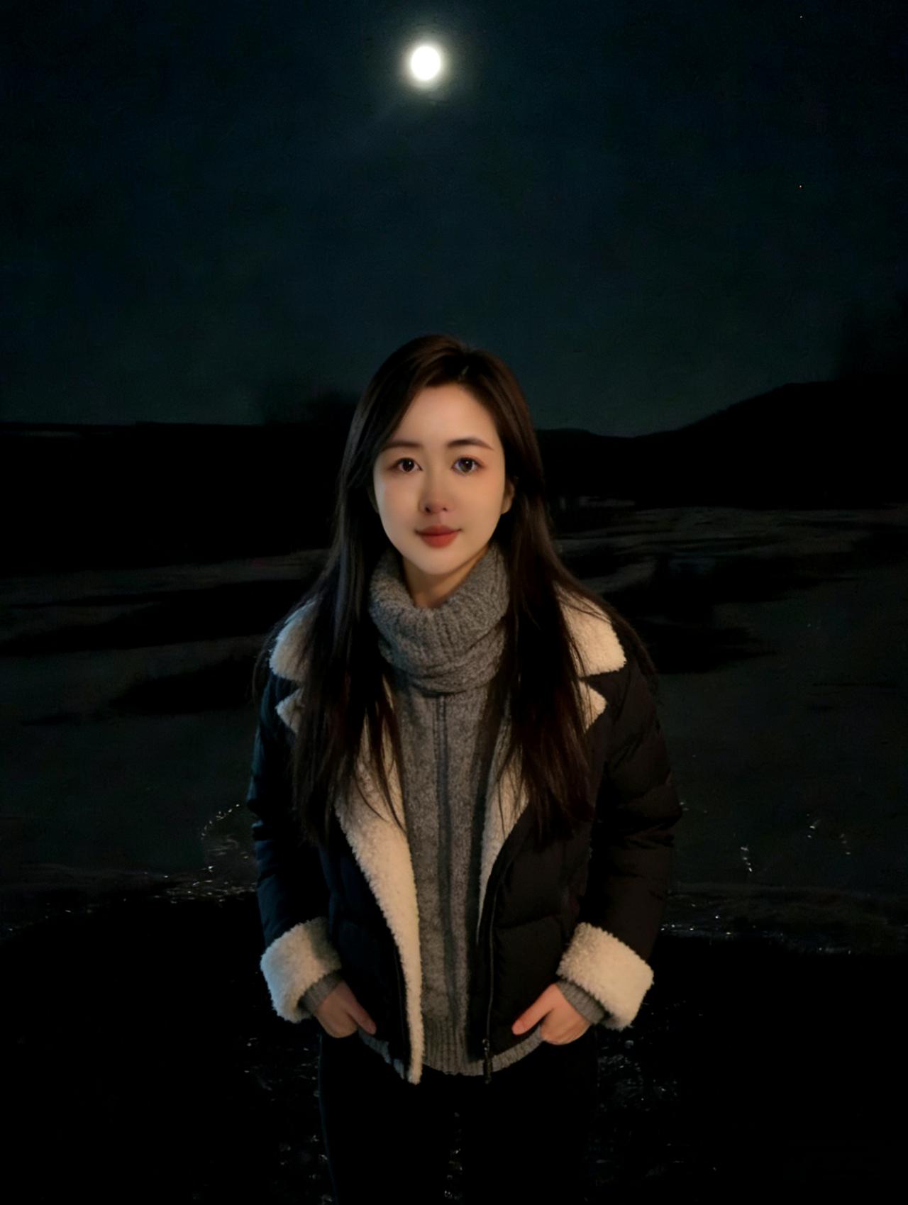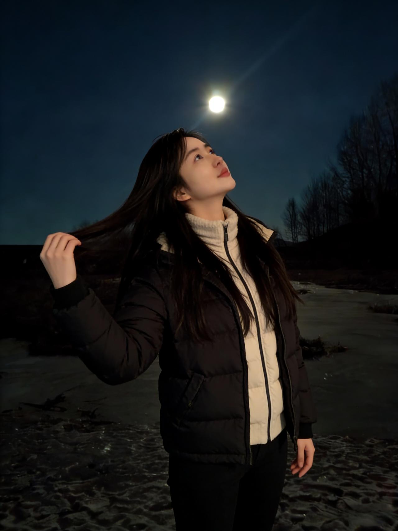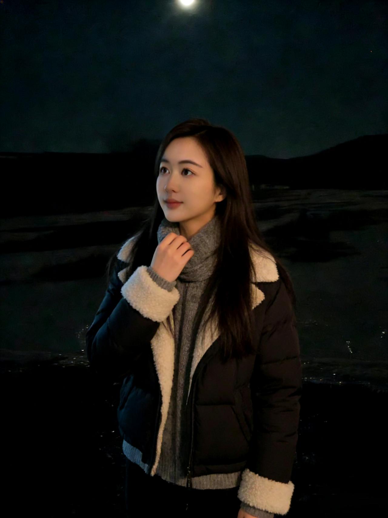 夜色把旷野揉成墨色的纸 月亮摁下一枚银白的印章 冰面结着薄霜 铺了一层散碎的月光 羽绒服裹着一身暖意 站在天地间 挺立成一株扎根的树 ~ 长发垂落的弧度 拂过黑白相间的领口 指尖垂在身侧 碰不到远处的枯枝 风从旷野尽头吹来 带着冰的凉 却吹不散眼底的静 天地辽阔,月色温柔 心也跟着沉成一片湖