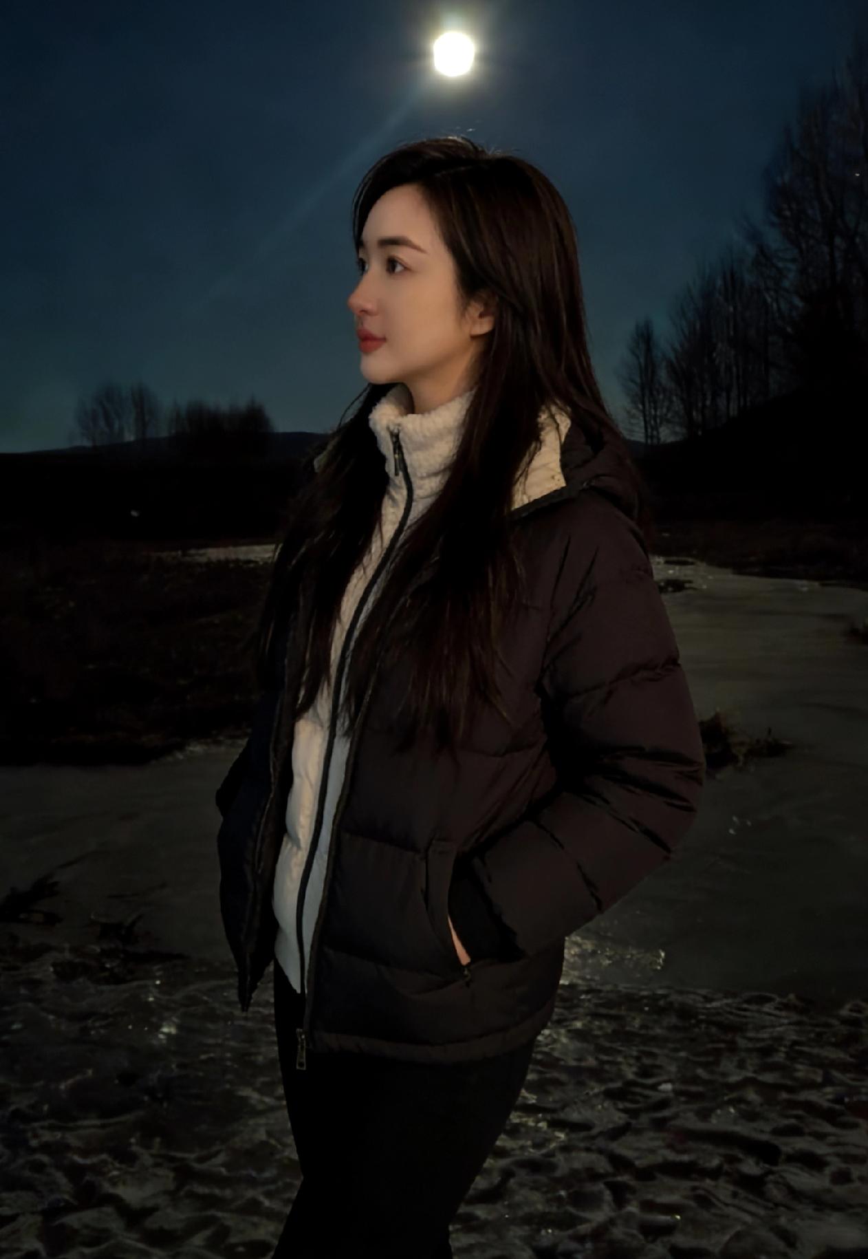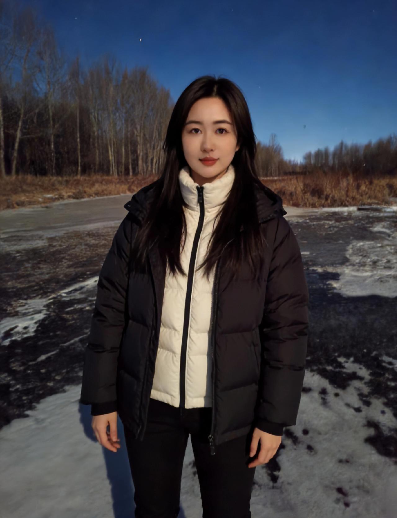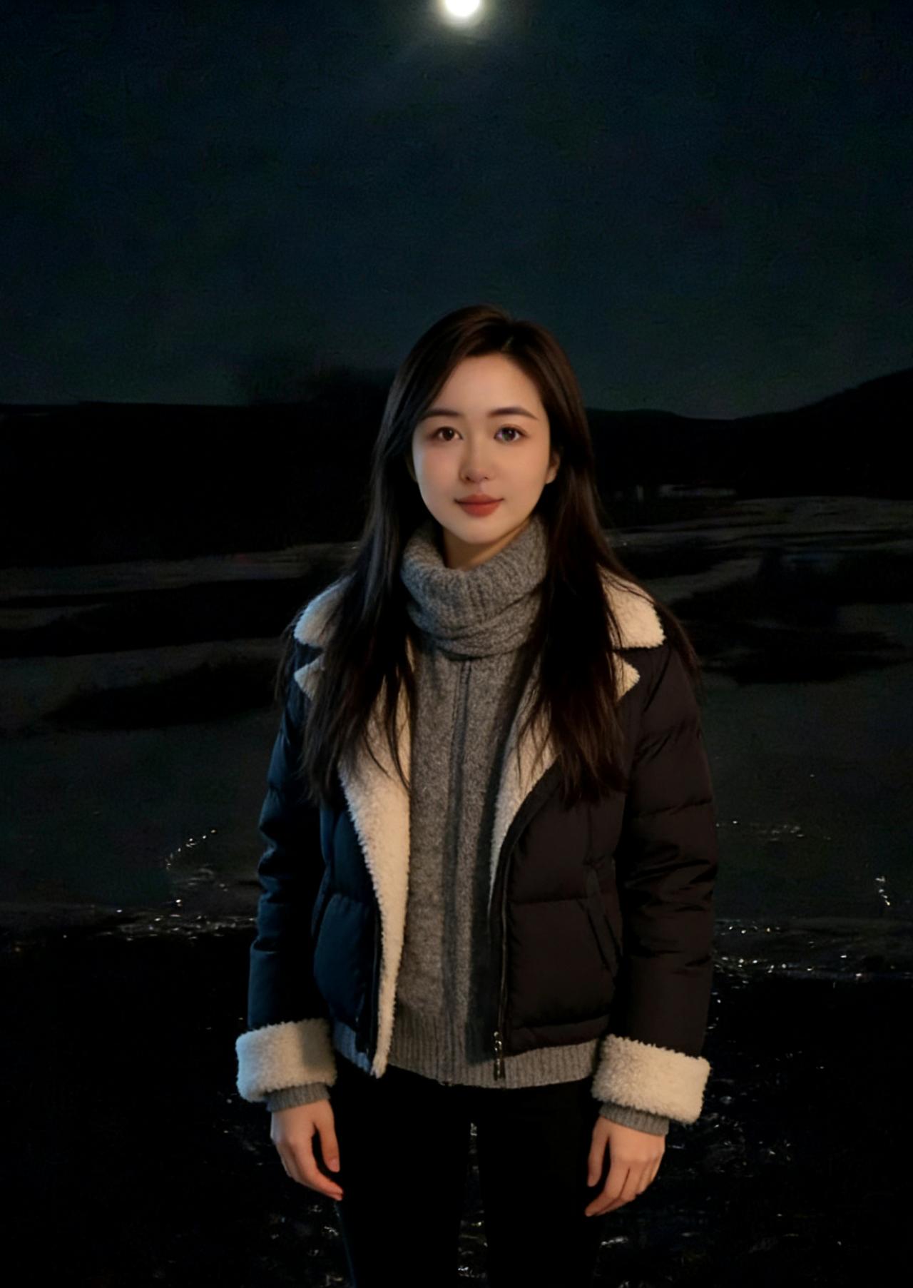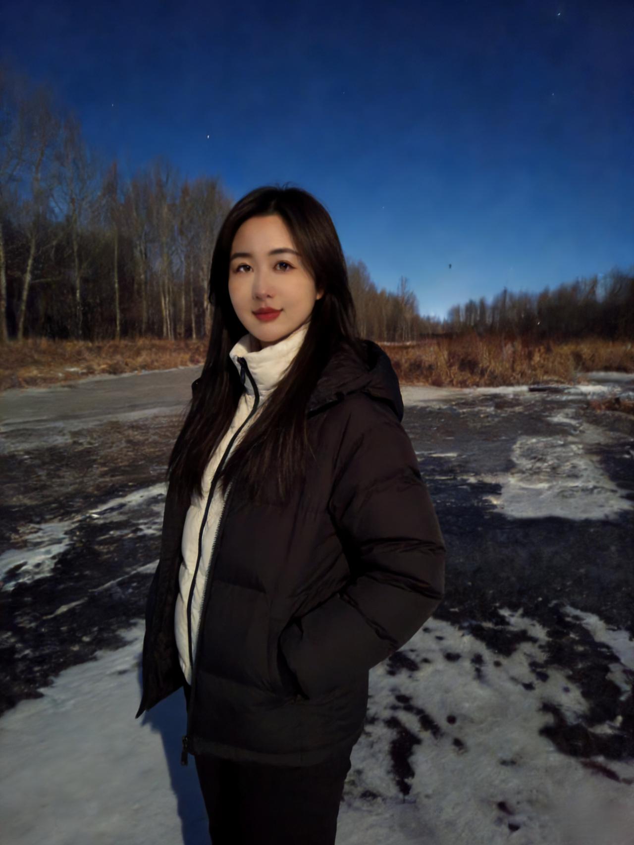 夜色把旷野揉成墨色的纸 月亮摁下一枚银白的印章 冰面结着薄霜 铺了一层散碎的月光 羽绒服裹着一身暖意 站在天地间 挺立成一株扎根的树 ~ 长发垂落的弧度 拂过黑白相间的领口 指尖垂在身侧 碰不到远处的枯枝 风从旷野尽头吹来 带着冰的凉 却吹不散眼底的静 天地辽阔,月色温柔 心也跟着沉成一片湖