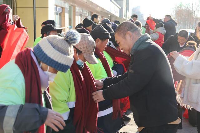 “摸着真厚实,真暖和!以后大清早扫街、顶着寒风保洁,围着它干活,再也不怕脖子灌风了!”环卫工人老张捏着围巾的边角,笑得合不拢嘴,还忍不住和身边的工友互相比划着围巾的样式。