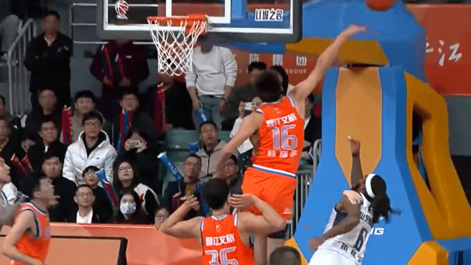 加时赛中,珀赛尔带球突破上篮,杨曦皓遮天大帽将球盖出底线。