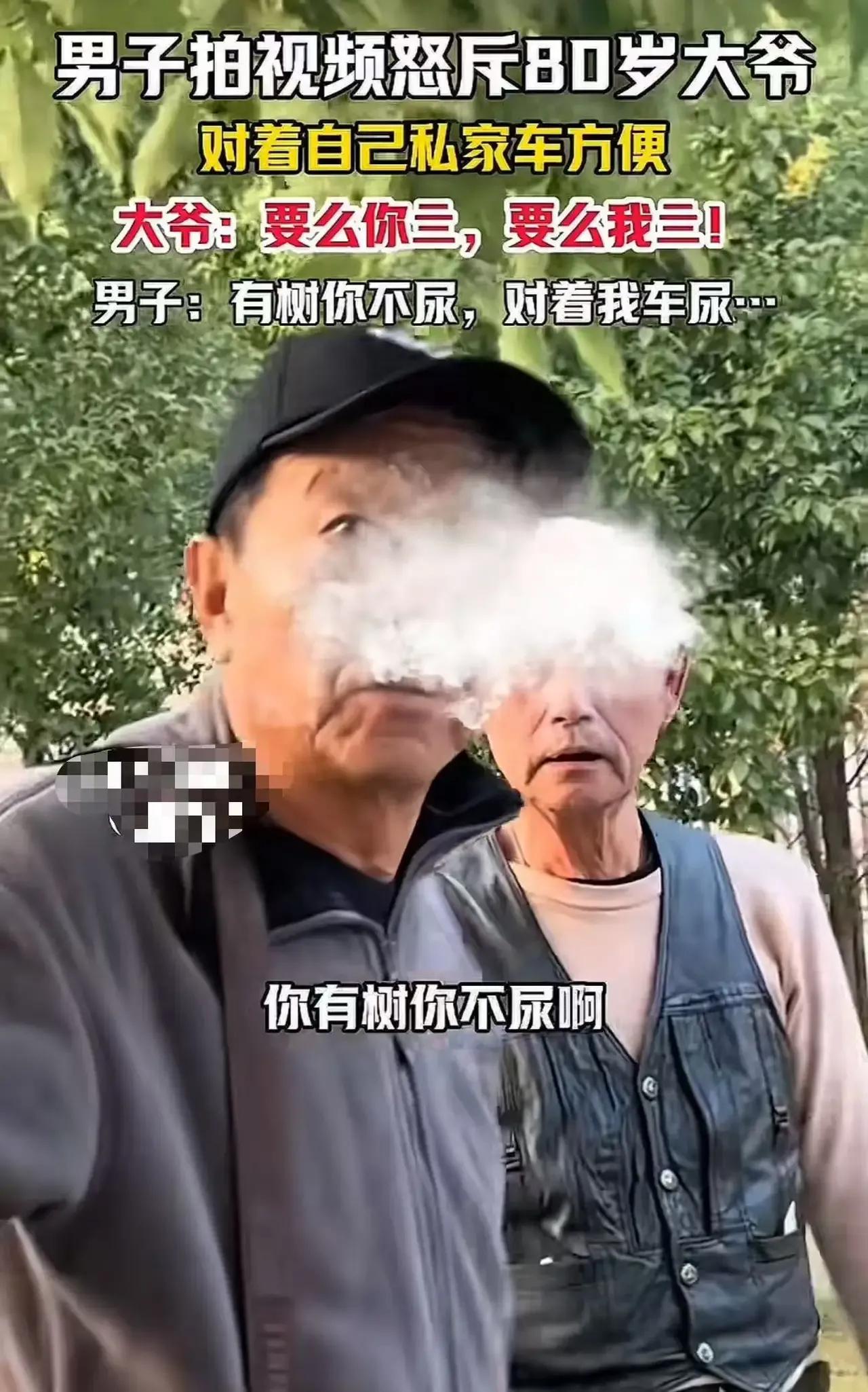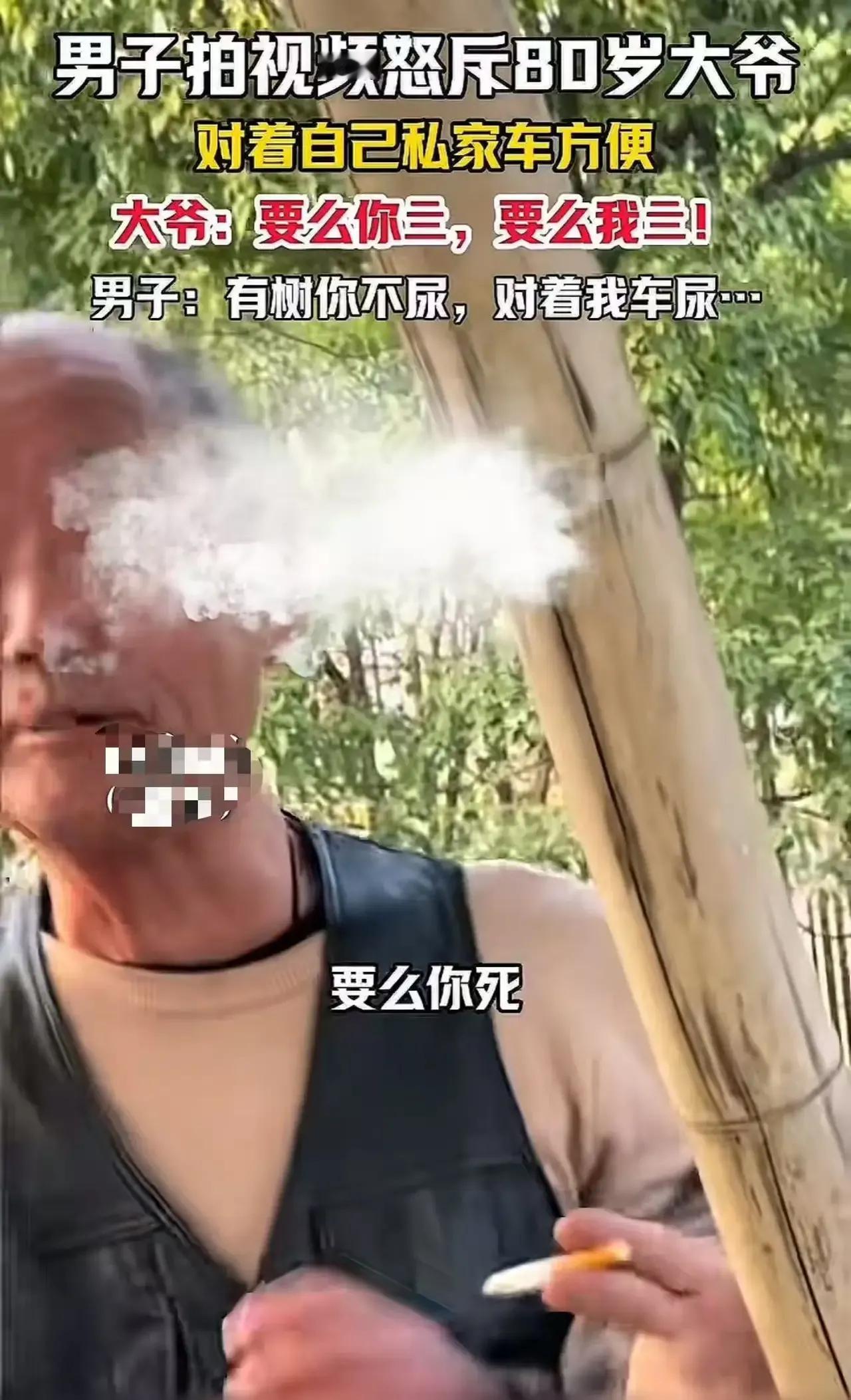 近日,一则“80岁大爷对着私家车尿尿,还放狠话”的视频引发网友热议,究竟是坏人变老了,还是另有隐情? 视频中,一名男子愤怒地指责一位80岁的大爷,称其对着自己的私家车尿尿。大爷不仅不道歉,反而放出狠话:“要么你死,要么我死!”男子气愤地表示,附近有树,大爷却偏偏选择对着他的车尿,这让他无法接受。此事迅速在网络上发酵,网友们纷纷留言表达看法。有网友调侃道:“我家狗狗都不会对着人家车尿,都知道找树根,这大爷真是比狗还不如。”也有网友表示理解,认为大爷可能是年纪大了,控制不住自己的行为。不过,更多网友还是站在男子这一边,认为无论年龄大小,都应该尊重他人的财物,不能因为自己年纪大就为所欲为。毕竟,尊重是相互的,不能因为年龄而成为不尊重他人的理由。 这件事虽然看似小事,但却引发了大家对于尊重与理解的深思。无论年龄大小,我们都应该学会尊重他人,遵守社会公德。对此你怎么看呢?快来评论区留言讨论吧!尿裤子的男人 公共场合撒尿 男厕所里尿尿
