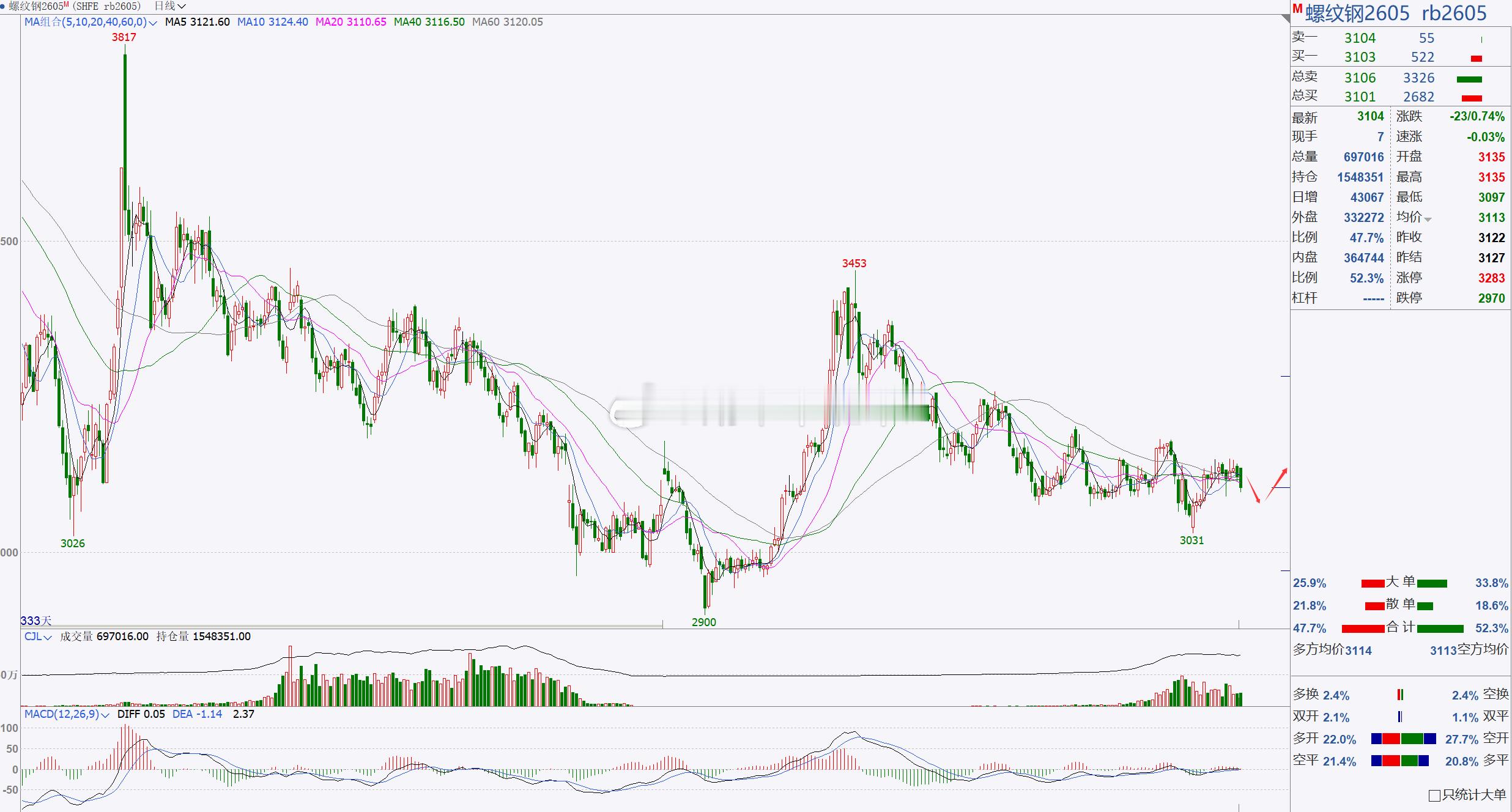 1、【焦煤2605】焦煤短线跟进即可!焦煤日内走回踩调整,并再次跌破1100一带,后市重点关注1100一带,建议短线跟进即可,但不过分看空间;稳健者建议先观望;例如空关注1098—1108附近,下方先关注1050附近;多关注1050跌破情况再择机考虑介入;(建议仅供参考,具体操作以开盘点位实时跟进,据此操作风险自担)2、【螺纹2605】螺纹短线跟进,重点关注3050一带!螺纹日内伴随回踩调整,目前来看螺纹表现一般,后市短线跟进即可,但不过分看空间,重点关注3050一带,稳健者建议先观望;例如空关注3120—3140附近,下方先关注3050附近;多关注3050附近再择机考虑介入;(建议仅供参考,具体操作以开盘点位实时跟进,据此操作风险自担)3、【铁矿石2605】铁矿石建议反弹偏空,短线跟进!铁矿石日内伴随短期探底反弹,目前来看铁矿石行情表现较强,后市我们重点关注810一带,若此位置未能突破延续,建议短线偏空跟进,看短期回踩修正,稳健者建议先观望;例如空关注803—808附近,下方先关注780附近;多关注780跌破情况再择机考虑介入;(建议仅供参考,具体操作以开盘点位实时跟进,据此操作风险自担)焦煤螺纹铁矿石