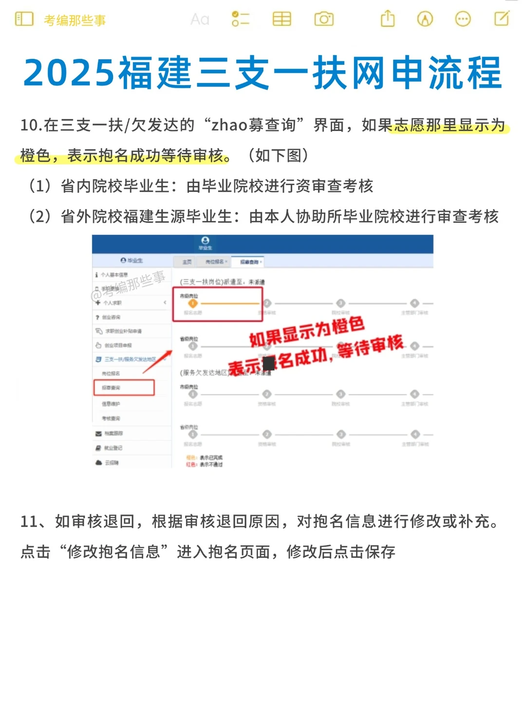 🔸10.在三支一扶/欠发达的“Z 募查询”界面,如果志愿那里显示为橙色,表示已完成,红色表示不通过