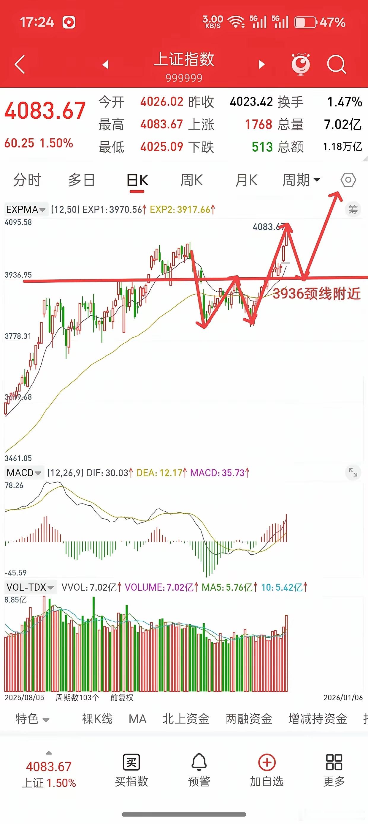 A股,从明天起,或许会开启洗盘模式!其实我目前对大盘的看法很简单,这一波我看的高度就是4057左右,上下差一点很正常。从3820附近,也就是12.16号和12.17号就提示右底机会,一直到3936颈线,以及突破之后,拉升的高度。右底到颈线距离1:1。3936-3815=121,3936+121=4057。当下,指数,再往上,我不会再去看涨,即使再往上涨,在我看来,没有意义,因为位置风险已经大于机会。而如果出现回踩,看哪里,第一位置EXPMA白线,差不多前顶12.29号高点3985附近,第二位置3936颈线附近。只有接近这两个位置,才是好的二次上车点。因此,这就是我个人看法,至于行情会不会这样走,那只能一起见证。