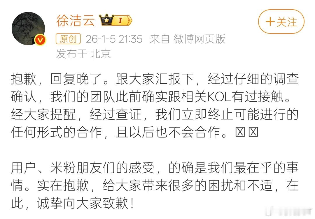小米终止相关KOL合作 就在刚刚,小米再次就近期风波发布回应。小米表示,经管理层研究,相关事件严重违背公司原则,也严重伤害米粉感情。故小米决定,辞退涉事负责经办人员,并对管理失职的集团副总裁许斐,以及公关部总经理徐洁云,予以通报批评,扣除2025年相关绩效成绩,并取消2025年度奖金。早前,徐洁云曾就相关事件回应称,确有接触,但已终止可能进行的任何合作,且以后也不会再有合作。小米称永不与大熊合作