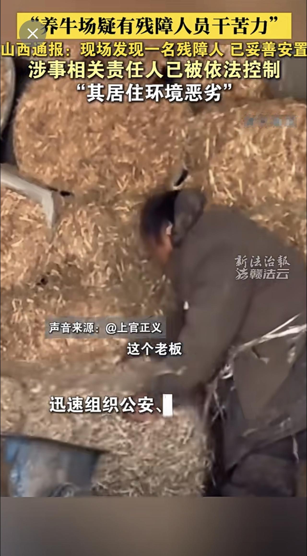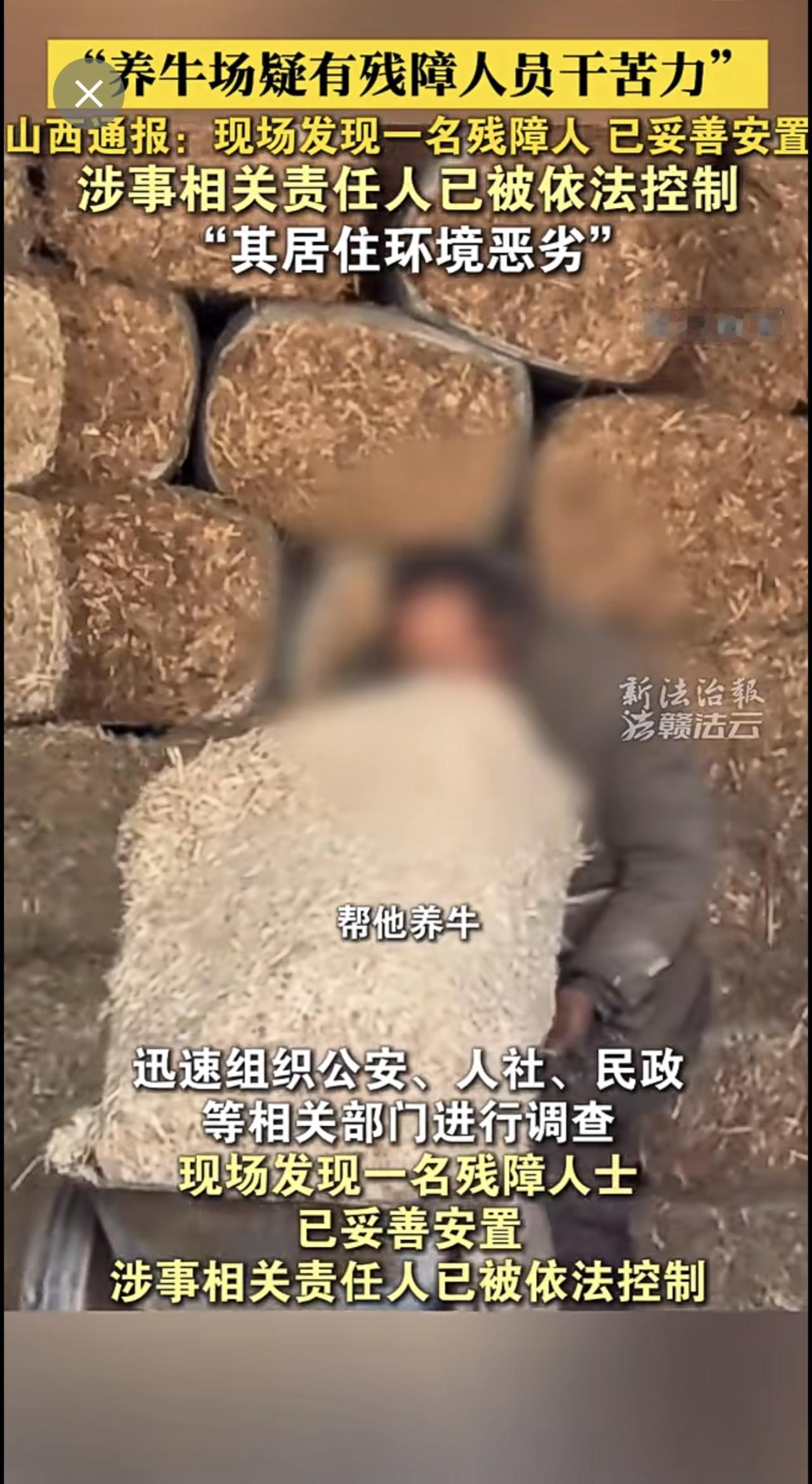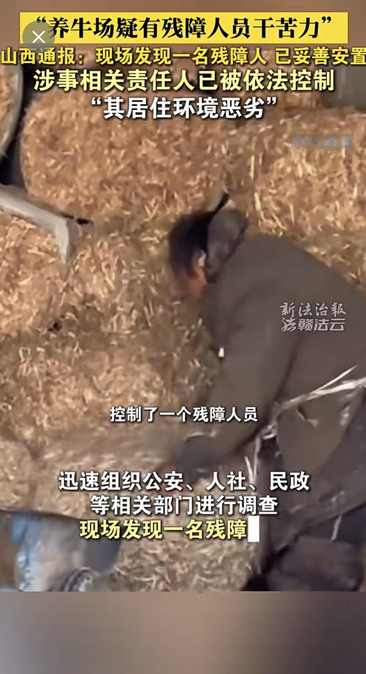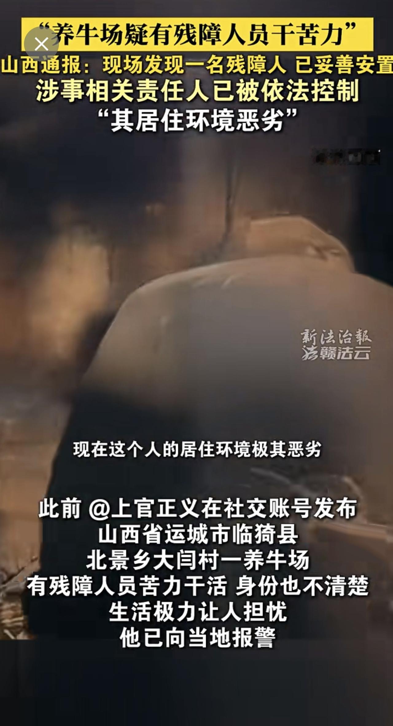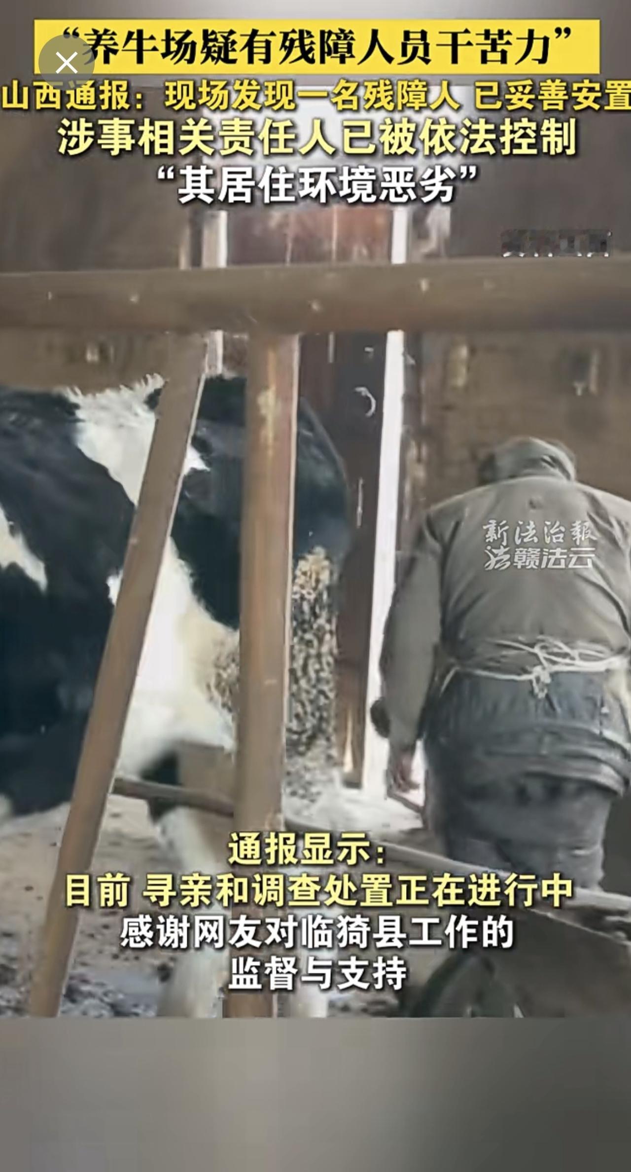 山西临猗通报“养牛场疑有残障人员干苦力”:现场发现一名残障人士,已妥善安置,涉事相关责任人已被依法控制。(来源:新法治报·赣法云客户端 熊玮)残障人员 山西 通报
