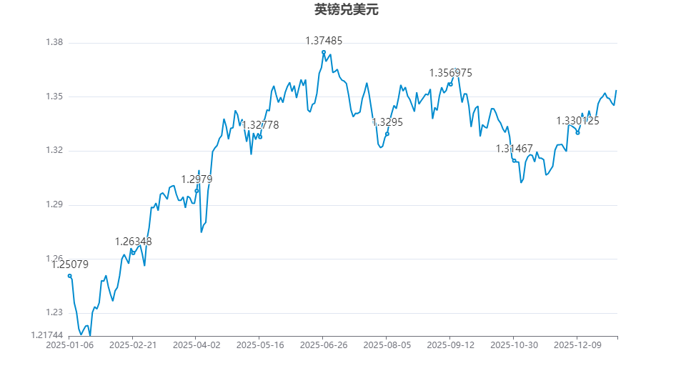 具体来看,2025年1月18日,英镑兑美元汇率触及全年最低点1.2168。此后,该汇率逐步回升,并于同年7月达到全年最高点1.3743。尽管下半年由于美元反弹导致汇率有所回调,但英镑全年仍稳定保持在1.30以上水平运行,年末汇率约为1.35。全年平均汇率为1.3183,明显高于2023年至2024年间1.20至1.30的箱体波动范围。