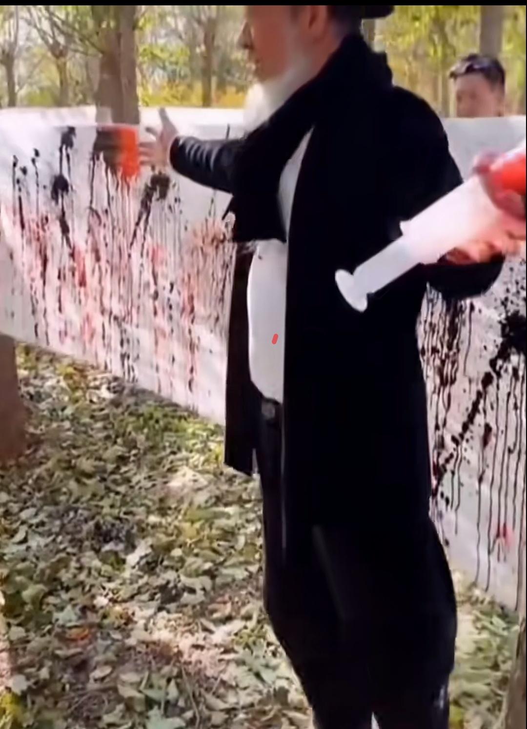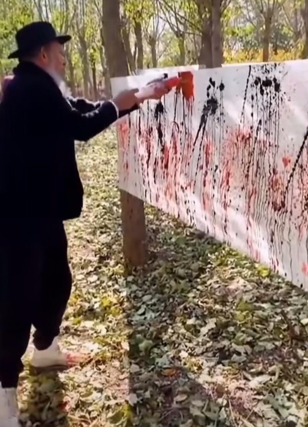 邵大湿射墨遭神评 有人发了一段“书法”大湿邵岩表演射墨的视频。只见邵大湿手持装有墨汁的大号针管,向着绷在两棵树之间的宣纸,像打水枪一样喷射。每射一次,完成一次左脚抬高、落地,同时右脚跟进的手脚配合,如是重复。但他动作笨拙,像是一个身体协调性不太好的人在练什么功法。喷完黑墨喷红墨,宣纸上满是大大小小的黑点红点,一片斑斑驳驳,却看不出汉字的样貌来。 这玩意儿竟然能被命名为听起来高大上的“射墨书法”,简直太扯。要我说,如此追求“人与墨的对话”,简直就是糟蹋好纸好墨,亵渎书法二字。 有两位网侠给出辛辣神评,感觉甚是贴切有趣,抄录如下,以飨诸君∶ 其一,“高台藏鼠辈,民间卧麒麟。大堂之上登猪狗,名流才子落街头”。 其二,“给大家科普一下:墨水中又加了一些四川的麻椒,写出来的字给人一种麻了个笔的感觉。”