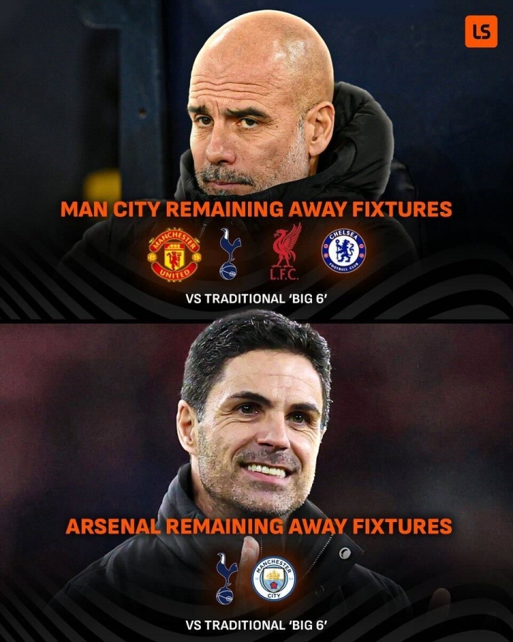 阿森纳和曼城均剩下9个英超客场,在这其中,曼城还要前往四支英超“BIG6”的客场,分别是曼联、热刺、利物浦和切尔西。