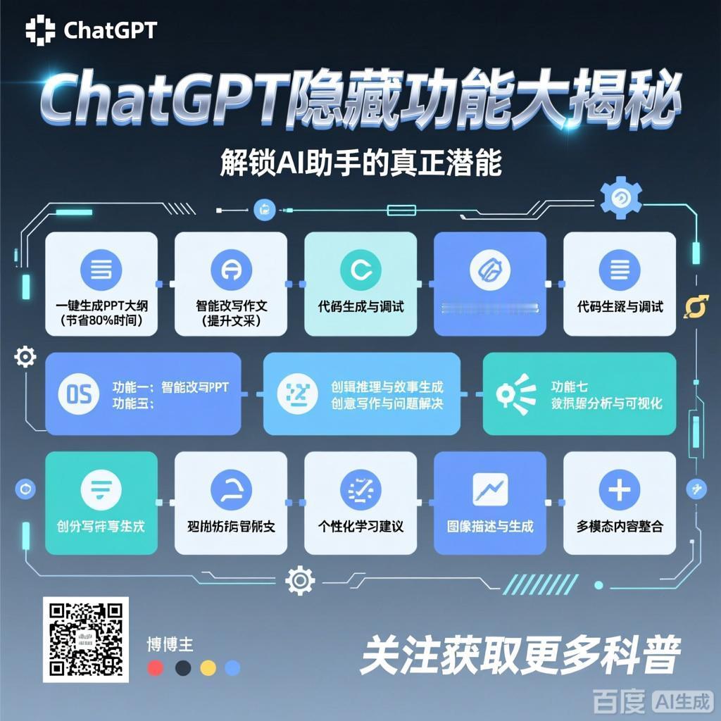 ChatGPT不会告诉你的10个隐藏功能,解锁AI新境界! 在这个信息爆炸的时代,ChatGPT犹如一颗璀璨的明星,照亮了智能助手领域。但大多数人只触及了它的表面,今天,就让我带你深入探索ChatGPT那些不为人知的10个隐藏功能,让你的AI体验瞬间升级! 1.跨领域知识融合:你以为ChatGPT只是文字处理高手?错!它能巧妙融合科学、艺术、历史等多领域知识,为你提供跨学科的创新视角。比如,用古典文学元素设计现代科技产品概念,激发你的无限创意。 2.个性化学习教练:不再是一成不变的问答模式,ChatGPT能根据你的学习进度和兴趣,定制专属学习计划。无论是编程、语言学习还是历史探索,它都能成为你的私人导师,让学习之路更加高效有趣。 3.情感智能分析:ChatGPT不仅能理解你的字面意思,还能感知文字背后的情绪色彩。当你心情低落时,它能提供安慰和建议;当你兴奋分享时,它能共鸣并延伸话题,成为你的情绪共鸣板。 4.创意写作伙伴:卡文了?ChatGPT来帮忙!它能根据你的风格生成故事开头、诗歌片段,甚至是整篇文章的草稿,激发你的创作灵感,让写作不再孤单。 5.高效生活助手:从日程安排到旅行规划,ChatGPT都能帮你搞定。只需简单描述需求,它就能生成详尽的计划表,甚至提醒你重要事项,让生活井井有条。 6.专业领域咨询:无论是法律咨询、医疗建议还是金融分析,ChatGPT都能提供基于公开信息的初步指导,虽不能替代专业人士,但足以让你在决策前有更全面的了解。 7.多语言无缝交流:ChatGPT支持多种语言,不仅能准确翻译,还能在对话中自然切换,帮助你跨越语言障碍,与世界自由沟通。 8.逻辑推理训练场:通过解决ChatGPT提出的逻辑谜题和推理问题,你可以锻炼自己的思维能力,提升解决问题的技巧,让大脑保持活跃状态。 9.个性化娱乐推荐:厌倦了千篇一律的推荐列表?ChatGPT能根据你的喜好和过往选择,推荐独一无二的电影、音乐、书籍,让你的娱乐生活更加丰富多彩。 10.持续学习进化者:最神奇的是,ChatGPT本身也在不断学习进化。随着用户反馈的积累,它的回答会越来越精准,功能也会越来越强大,意味着你的AI伙伴永远在成长,与你同行。 掌握这些隐藏功能,ChatGPT就不再是一个简单的聊天工具,而是你生活中的多面手,学习上的加速器,创作上的灵感源泉。它正以一种前所未有的方式,改变着我们获取信息、解决问题、创造价值的方式。现在,就让我们一起解锁ChatGPT的无限可能,开启智能生活的新篇章吧!