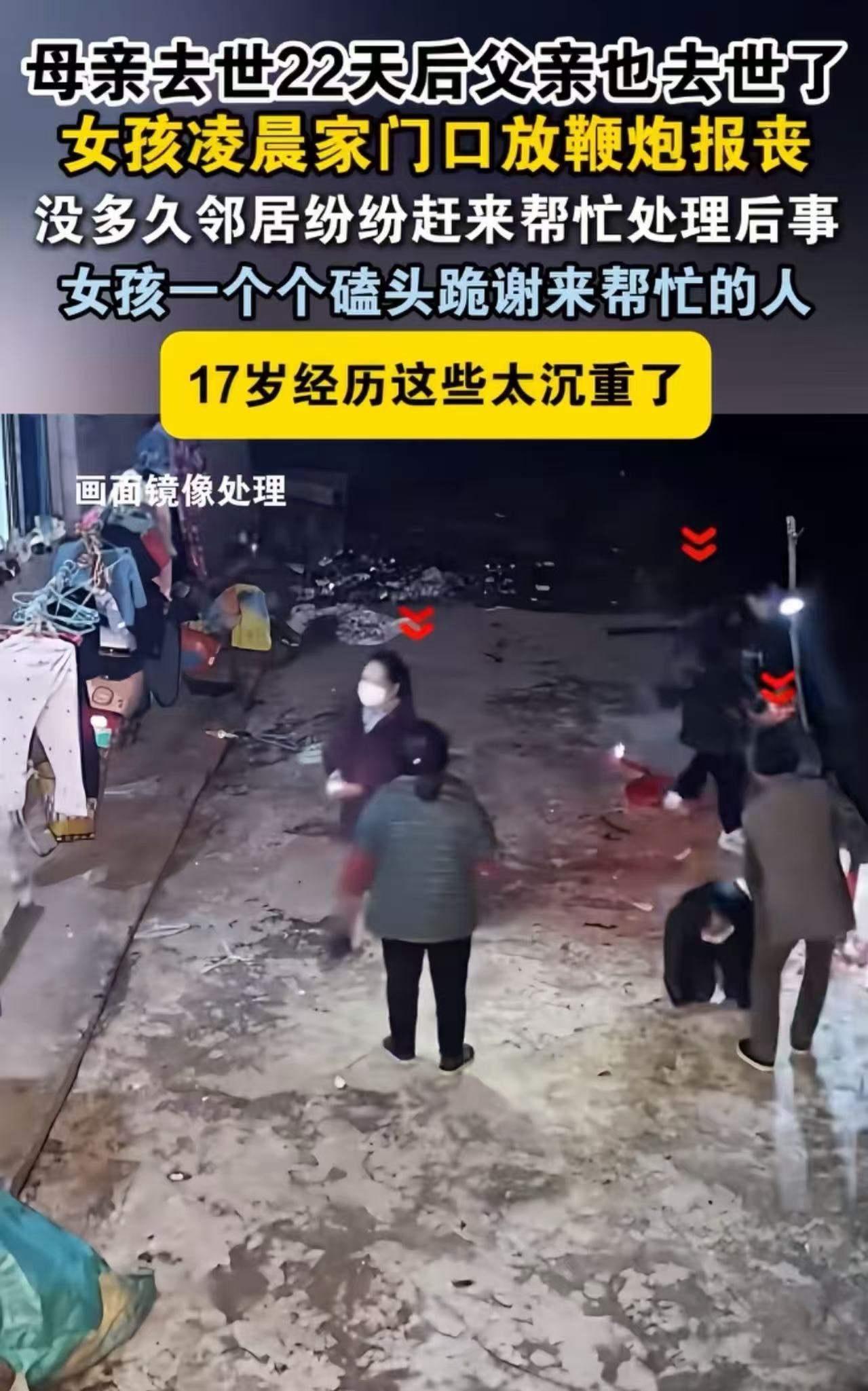 太令人心痛了!母亲去世才22天,父亲也随之离开,留下这个年仅17岁的女孩孤身面对人生最沉重的打击。她站在家门口,点燃一串鞭炮,仿佛用那一瞬间的火光,向世界宣告:她还在坚持,还在努力。这个动作,令人心碎,却又让人深深敬佩。 或许有人会问,这个年纪本应是无忧无虑的年华,为什么她要用如此沉重的方式表达自己的悲痛?但谁又能真正理解,一个孤独的灵魂在失去至亲时的那份撕心裂肺?她用点燃鞭炮的方式,或许是想用火光驱散心中的阴影,或许是在向逝去的亲人告别,也是在告诉自己:无论多难,我都要坚强。 邻居们纷纷赶来,帮忙处理后事,大家的善意和温暖成为这个寒冬里最暖心的力量。而在众人忙碌的瞬间,她的一个动作,成为所有人心中的泪点——那是她用微弱的身躯,传递着无限的坚韧与不屈。 网友们纷纷留言:17岁的她,经历了如此沉重的打击,依然没有倒下。有人说:“这样的经历,太沉重了,但她的坚强令人动容。”也有人感叹:“她用行动告诉我们,即使在最黑暗的时刻,也要坚持走下去。”这不仅仅是一场丧事,更是一堂关于生命、关于坚韧的深刻课。 或许,我们每个人都曾在生活中遇到挫折与痛苦,但像她一样,用行动去面对,用心去感受,才能真正理解生命的意义。她的故事让我们明白:无论多么艰难,只要心中有希望,就能迎来新的曙光。 让我们为这个坚强的女孩点赞,也希望所有在困境中的人,都能从她的勇气中汲取力量。人生的路上,没有一帆风顺,但只要心怀希望,就一定能走出阴霾,迎来属于自己的光明。她的故事,值得我们每一个人深思,也希望在未来的日子里,她能找到属于自己的幸福和希望。妈妈去世