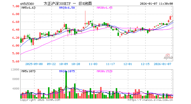 1月7日,截止午间收盘,方正沪深300ETF(515360)涨0.10%,报6.741元,成交额34.82万元。方正沪深300ETF(515360)重仓股方面,宁德时代截止午盘跌0.87%,贵州茅台跌0.13%,中国平安涨0.16%,招商银行跌0.77%,紫金矿业跌1.22%,新易盛涨1.09%,中际旭创涨2.54%,美的集团跌0.46%,东方财富跌1.71%,长江电力跌0.40%。