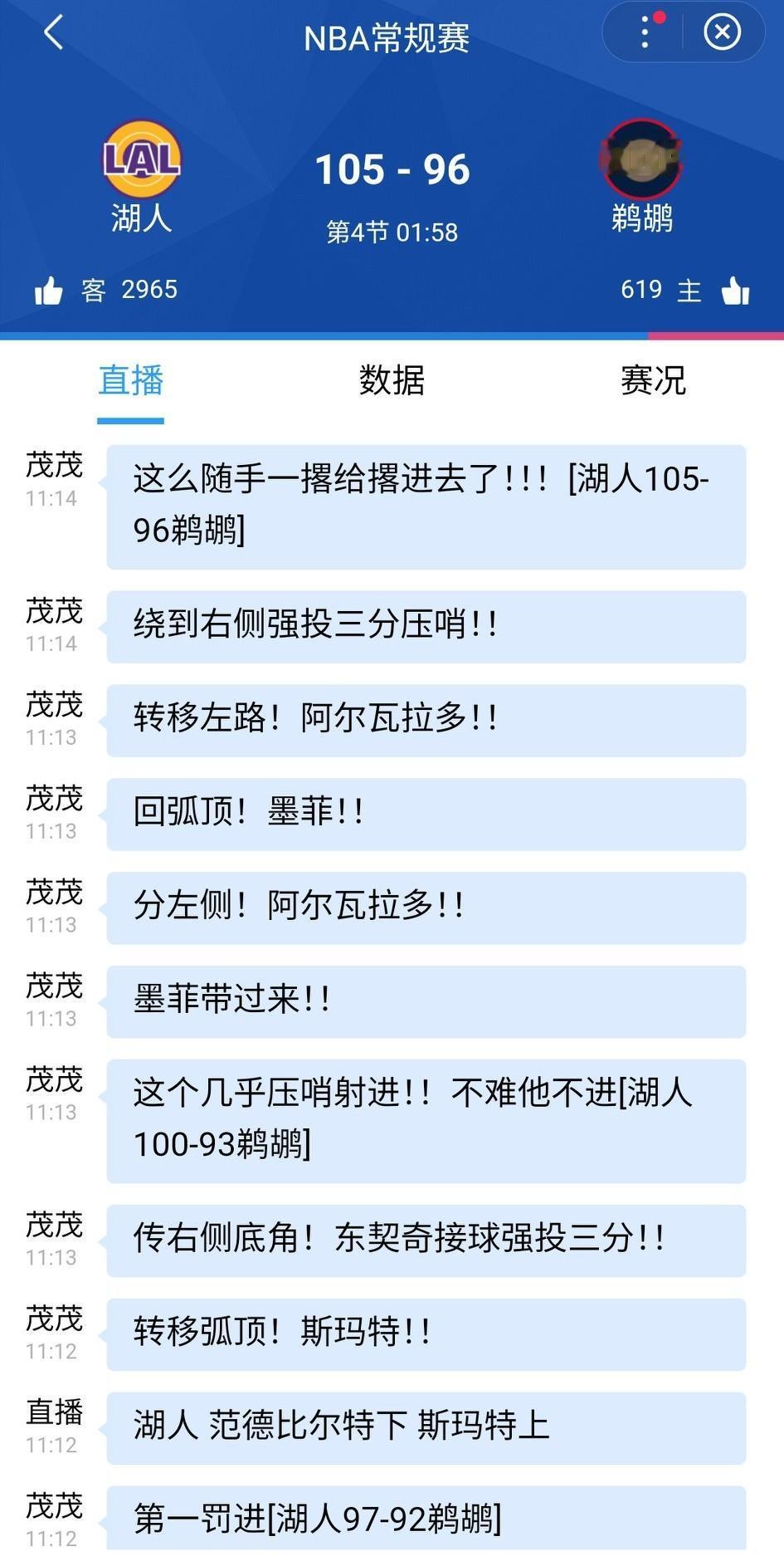 东契奇回来了,一个失误一个压哨三分,湖人100-93鹈鹕,距离比赛还有三分半,湖人要收割比赛了。 还有2分钟,比赛悬念越来越小了,东契奇又进了三分,真的是不难不进啊!湖人105-96鹈鹕。 同样的收官流程又是东子来走,东契奇关键时刻太恐怖了!