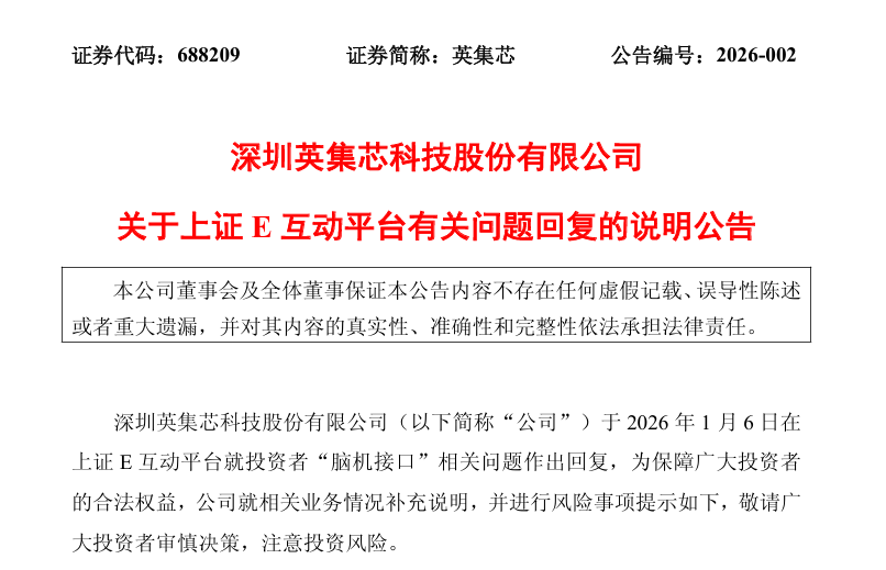 1月6日,英集芯(688209)通过投资者互动平台透露关于脑机接口芯片领域的早期投资布局。当晚,上交所对公司下发监管工作函,处理事由为“关于深圳英集芯科技股份有限公司E互动回复内容的监管工作函”。