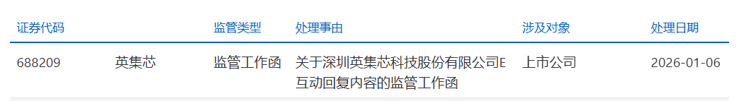对此,1月6日晚间,英集芯收到上海证券交易所下发的监管工作函,处理事由为“关于深圳英集芯科技股份有限公司E互动回复内容的监管工作函”。
