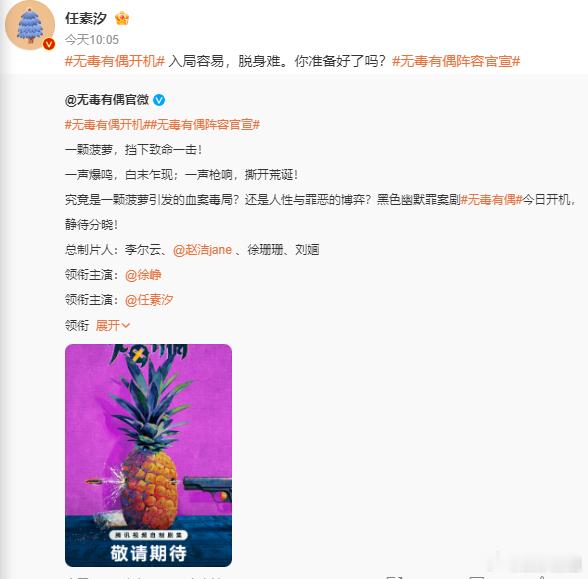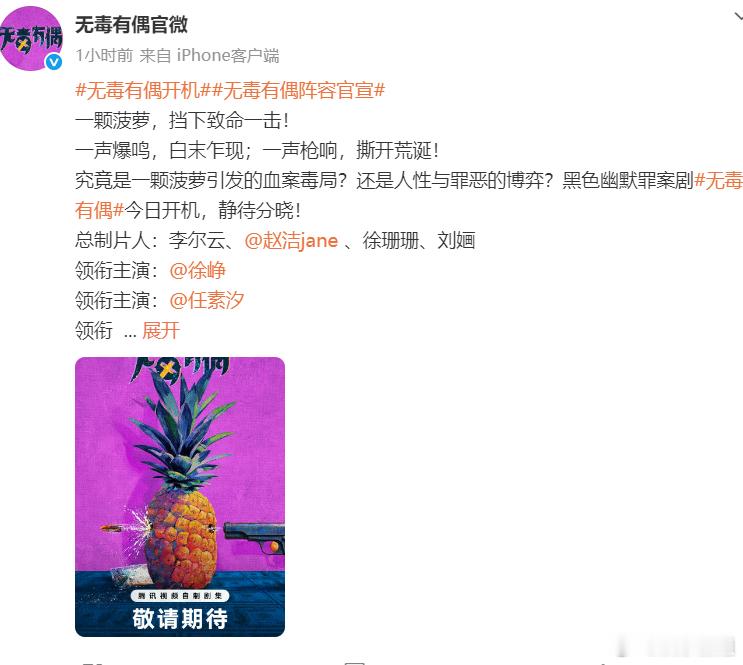 徐峥任素汐领衔主演徐峥任素汐领衔主演电视剧《无毒有偶》今日开机了。剧情说:边陲小镇离奇双尸命案为引,徐峥饰演的卖菠萝前缉毒警徐向阳,本想隐姓埋名却卷入毒局;任素汐饰演的女工沈丹失手杀夫后深陷生存漩涡!入局容易,脱身难。期待早日与你们相见!2025微博之夜爆款创作大赛