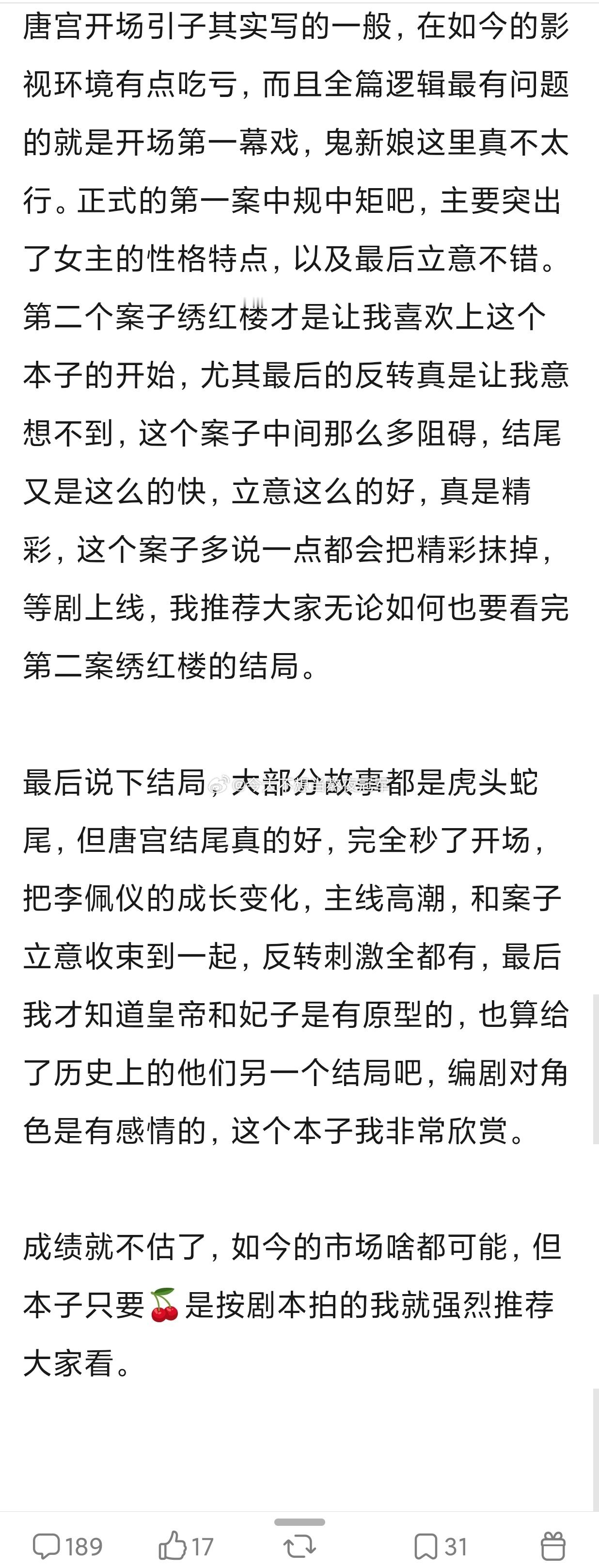 白鹿 王星越《唐宫奇案》剧本repo🈶,预排👖2月寒假档播出。比较纯粹的探案古装,女主智力武力值担当,男主最佳辅助。剧情走女性叙事,落地不悬浮,但探案过程中缺少钩子。cp剧情浓度不高,男女主有羁绊,但主线还是共同查案,预测是依靠剧情立意走口碑剧路线。白鹿给闺蜜呵呵买车