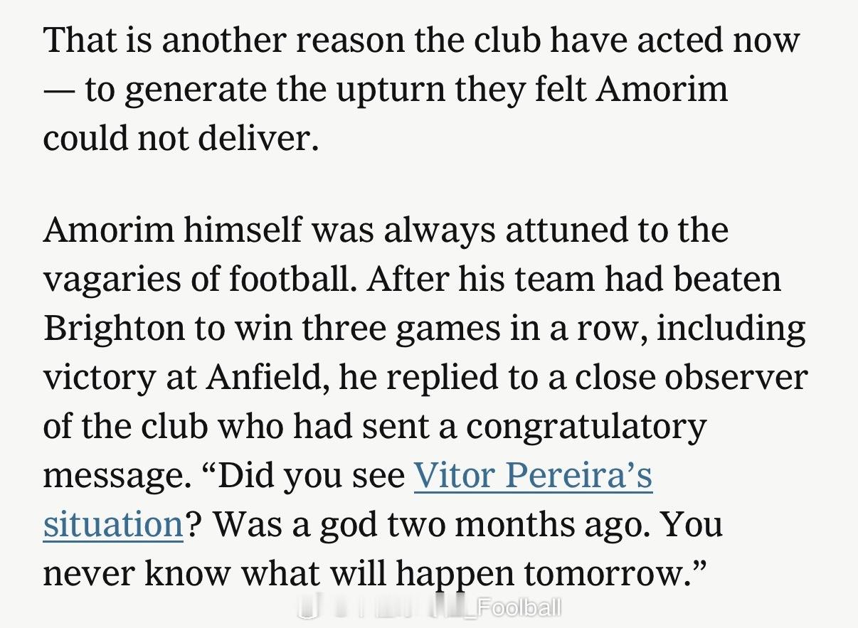 “Home. ”阿莫林和助手们收拾东西的时候遇到了早到的队员,队员们问他们要去哪儿是,他们回答“回家”。英超联赛曼联曼联解雇阿莫林