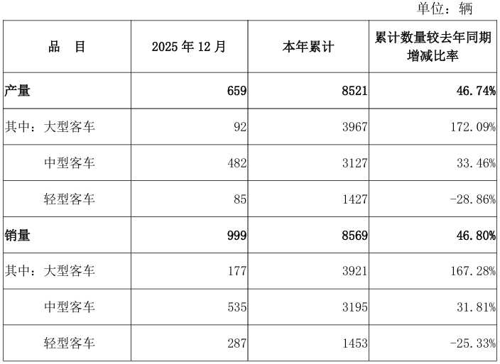 1月7日,安凯客车(000868)发布公告,2025年12月,公司产量为659量,本年累计产量为8521量,累计产量同比增长46.74%;公司当月销量为999量,本年累计销量为8569辆,累计销量同比增长46.80%,具体数据详情如下: