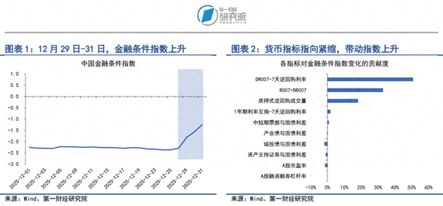在2025年12月29日至12月31日当周,第一财经研究院中国金融条件日度指数均值为-1.54,较前一周上升0.79。从指数的成分指标来看,上周货币指标指向紧缩,带动指数上行。从货币指标来看,年末银行间市场资金面收紧,主要货币市场利率明显上升,银行间市场流动性分层现象加剧。从债券指标来看,信用债收益率持续走低,信用利差区间震荡。从股市指标来看,A股市盈率与成交量同步上升。
