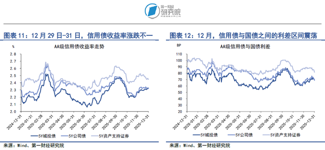 在2025年12月29日至12月31日当周,各品种信用债收益率涨跌不一。在AAA级债券中,5年期城投债、公司债和资产支持证券收益率分别下降3.15BP、上升0.18BP和下降0.68BP。在AA级债券中,5年期城投债、公司债和资产支持证券收益率分别上升1.18BP、下降0.92BP和下降0.93BP。