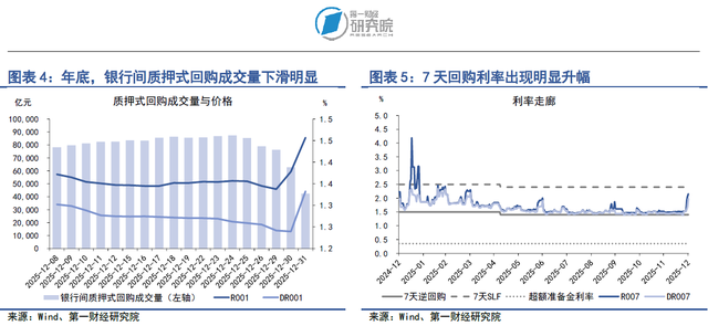 在2025年12月29日至12月31日当周,临近年底,银行间市场资金面出现明显紧缩。从成交量来看,上周银行间市场质押式回购成交量均值为6.04万亿元,较前一周下降2.44万亿元。12月31日,银行间市场质押式回购成交量出现较为明显的下滑,由前一交易日的7.62万亿元下降至4.23万亿元。