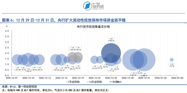 在2025年12月29日至12月31日当周,央行共通过7天逆回购投放资金1.32万亿元,共有1526亿元的逆回购到期,央行净投放资金1.17万亿元。临近年末,央行通过扩大流动性投放保持市场资金面平稳。