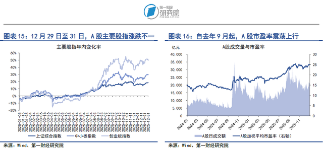 上周,A股成交量和市盈率同步回升。在12月29日至12月31日当周,A股日均成交量约为2.11万亿元,较前一周上升8.3%;市盈率为24.98,较前一周上升0.8%。从A股的杠杆情况来看,截至12月31日,A股融资融券余额达到2.52万亿元,融资余额占总市值的比重为2.34%。