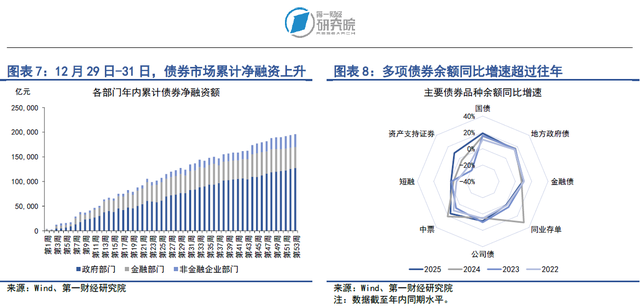 从债券余额增速来看,2025年多项债券余额同比增速超过往年同期。截至12月31日,政府部门债券余额同比增速为16.8%,较2024年同期增速上升0.6个百分点;金融部门债券余额同比增速为6.3%,较2024年同期增速下降8.6个百分点;非金融企业部门债券余额同比增速为7.9%,较2024年同期增速上升2.4个百分点。