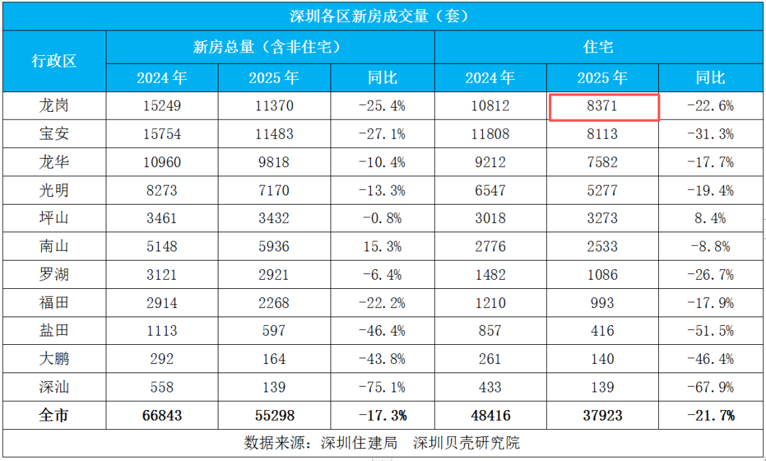 聚焦到整体数据来看:2025年深圳卖出约3.79万套新房住宅(含现售)、约5.62万套二手房住宅,合计约9.41万套住宅房源。